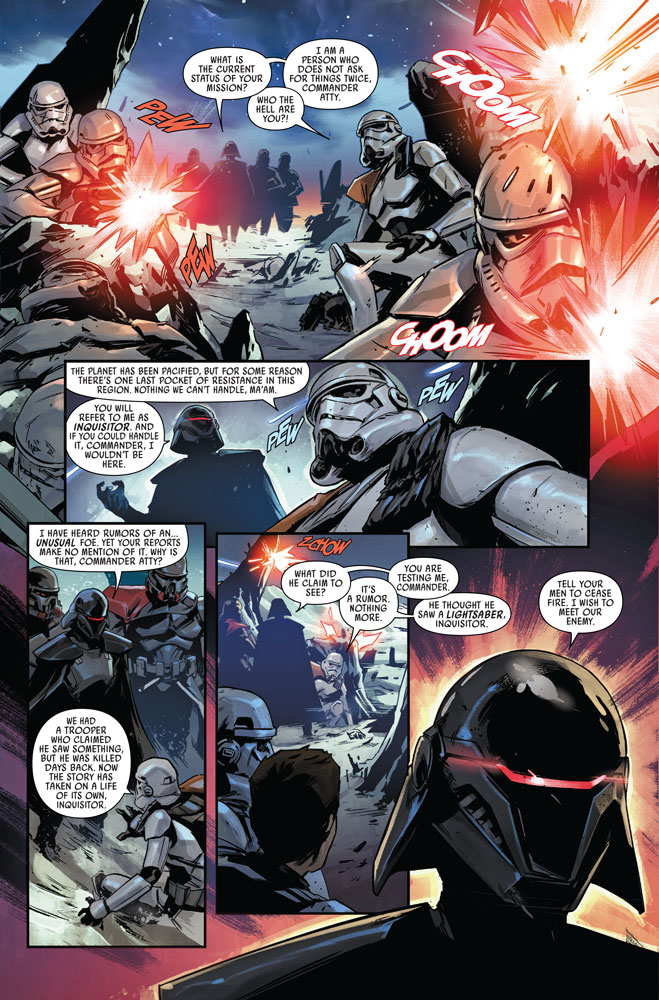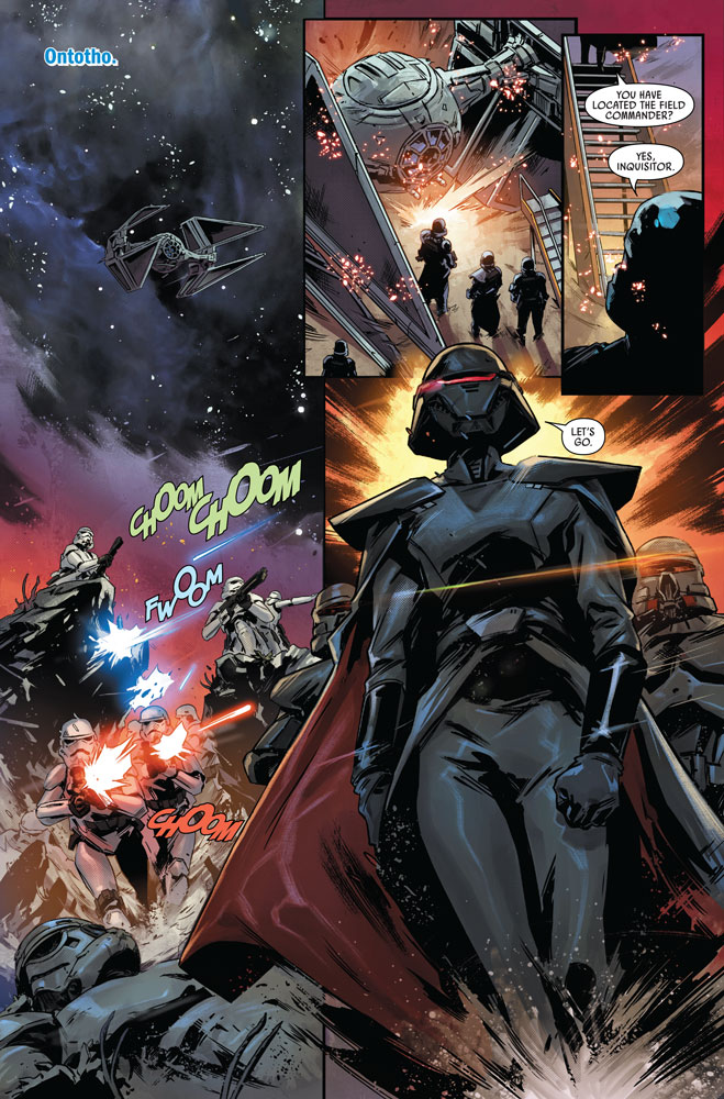 Star Wars: Jedi - Fallen Order: Dark Temple initially takes place between Episodes III and IV in the larger Star Wars saga, and the first issue--which came out today-- starts off on the planet Ontotho, where the Inquisitor named the Second Sister is hunting down a Jedi Knight who somehow managed to escape Emperor Palpatine’s Order 66. We then flashback to the days of the Republic, where we are introduced to Jedi Master Eno Cordova (possibly named after Star Wars author Zoraida Córdova?) and his impetuous Padawan learner Cere Junda.