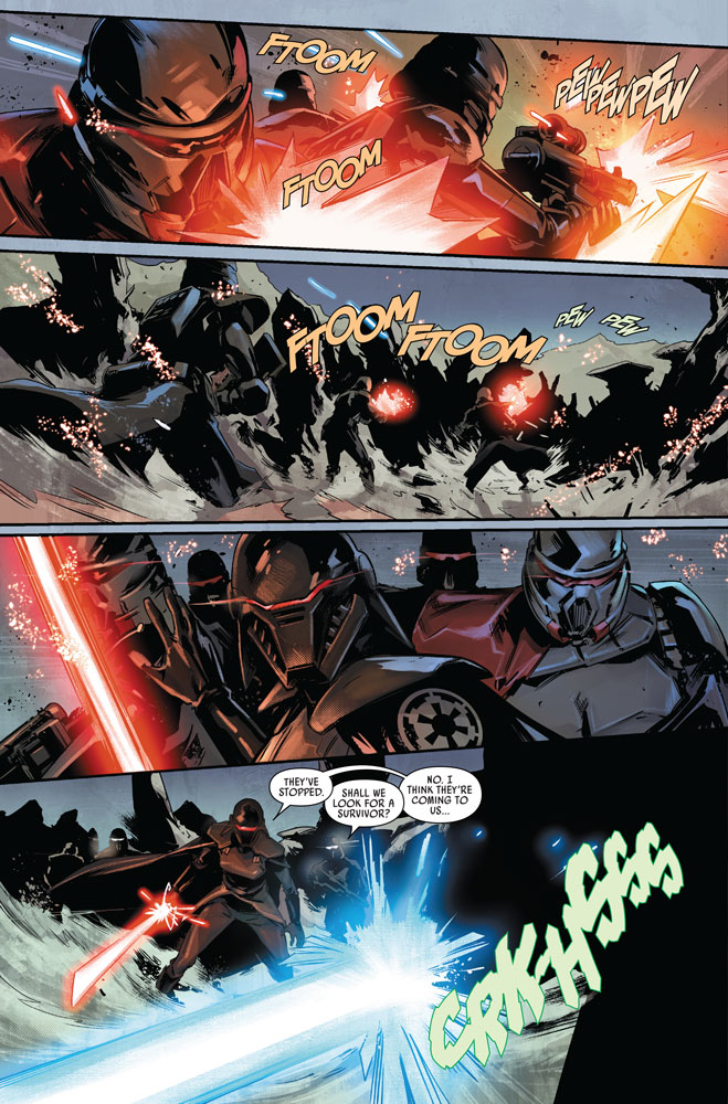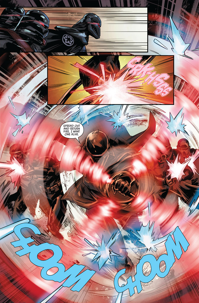 This comic gets things off to a great start, and I’m very interested to see where things go from here in the coming months, and they hopefully have the story pay off in the Star Wars: Jedi - Fallen Order video game. Writer Matthew Rosenberg (The Punisher, Uncanny X-Men) is a pitch-perfect choice to convey that Star Wars feel, and I especially appreciate how he was able to capture the voices of certain characters-- I could almost hear Master Windu speaking in Samuel L. Jackson’s stoic voice. The art by Paolo Villanelli (Star Wars: Vader - Dark Visions, Tony Stark: Iron Man) is kinetic and evocative, drawing the reader into the story with spinning lightsabers and dynamic explosions.