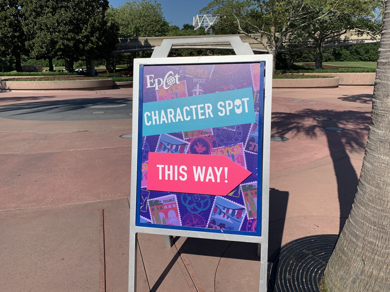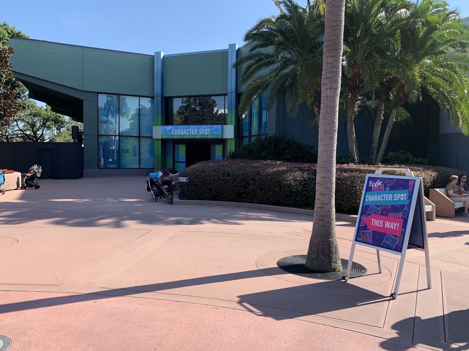 Signs point the way to the new Epcot Character Spot on the backside of Innoventions West.