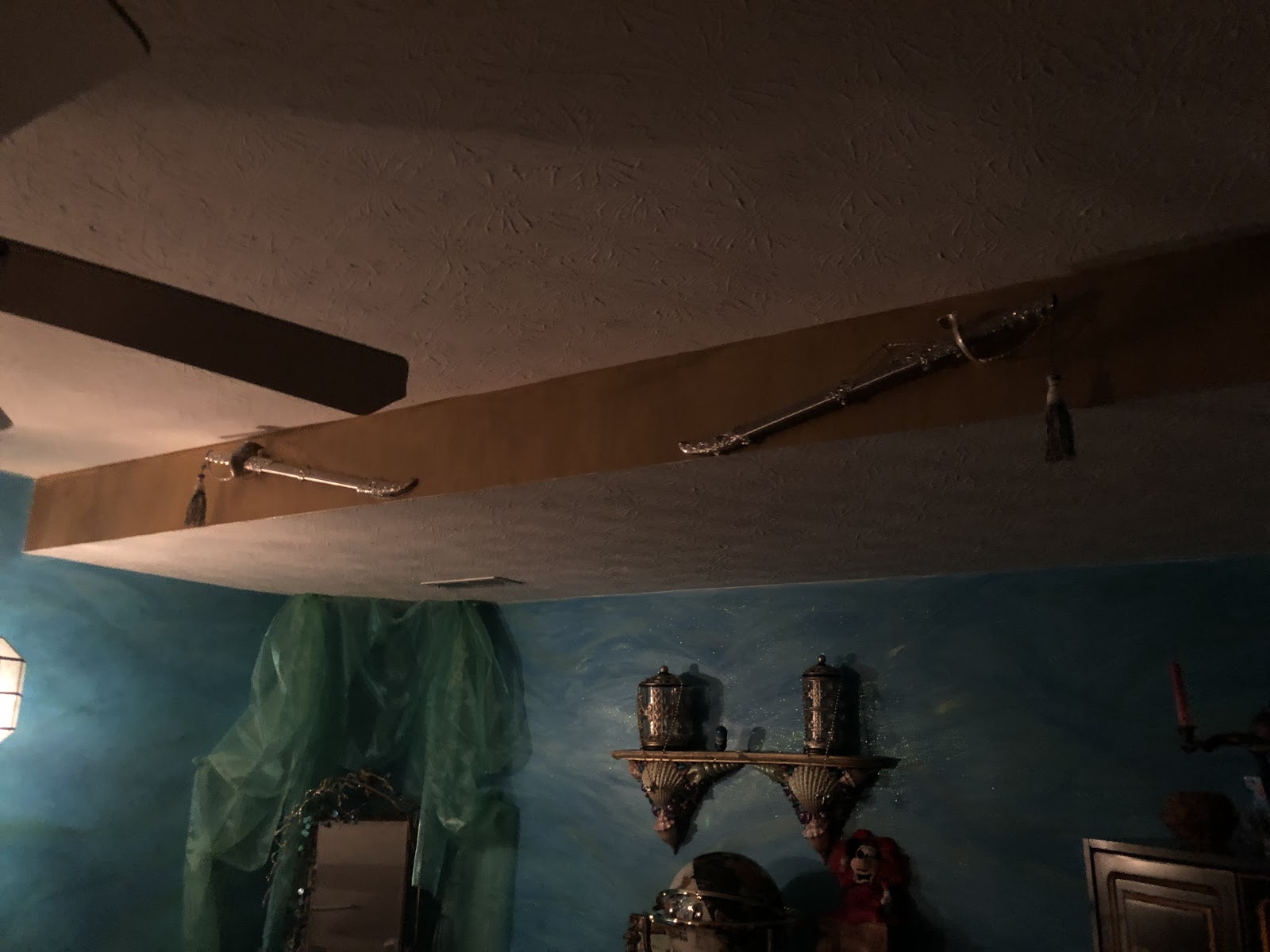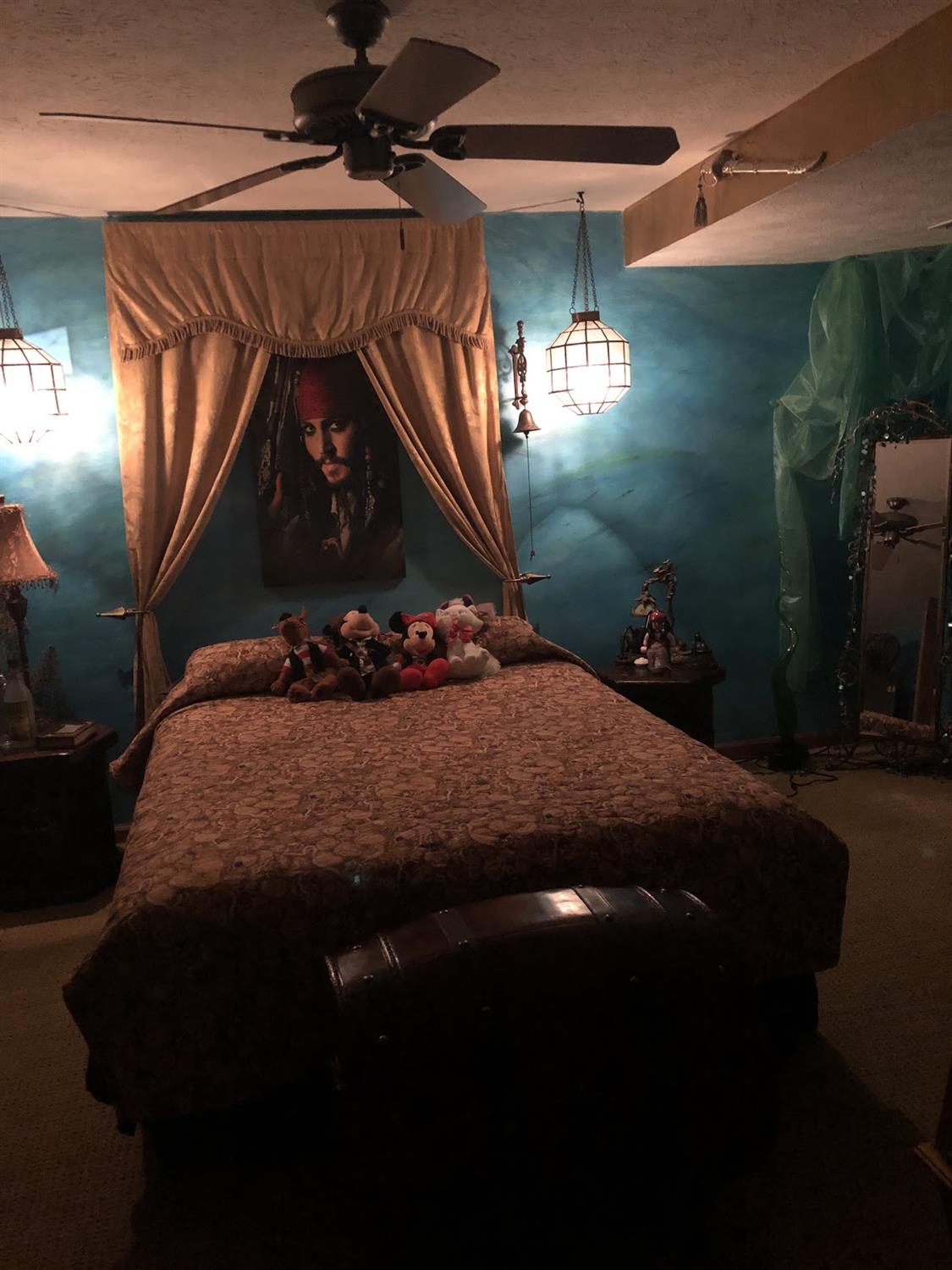 I started to show people the room and the reaction was priceless. When friends come to stay they always request the pirate room over the Mickey room (the Mickey room....that’s another story for ANOTHER time) and a surprising tradition began. When people stayed in the room, they would leave something in it. My friend Kendra left her necklaces from the flying pig because it was pirate booty. And she sent me a Jolly Roger flag when she got home.