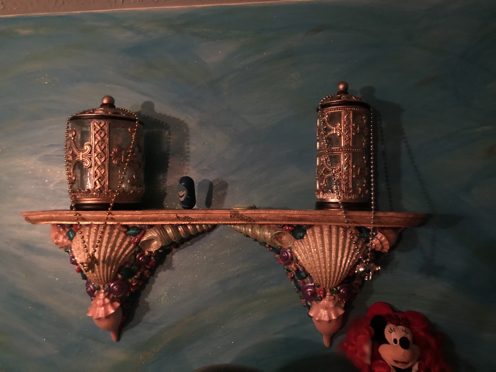 My friend Bruce left a weeble style Bruce figure and a Mike Wazowski dangle from Tokyo Disney with his name on it, on the shelf that Darla made and painted. Bruce is now in heaven with Walt so it makes me smile to see it.