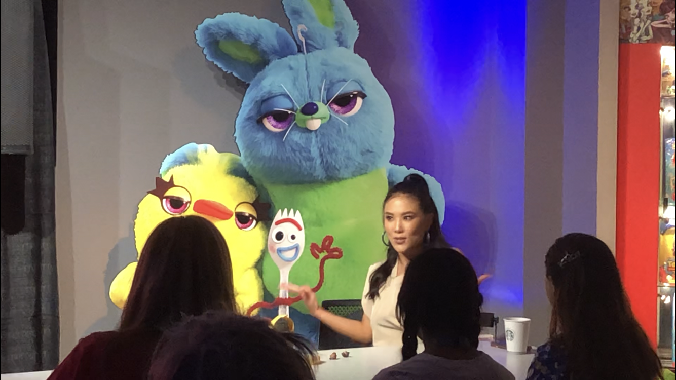 Giggle McDimples herself, Ally Maki, entered the room after a short viewing of a bonus feature on the upcoming release where we see what the process of laying down vocal tracks is really like and told us what she’d like to see for her character in the future, dropping hints about the potential of a Giggle McDimples spin-off series on the upcoming streaming platform, Disney+.