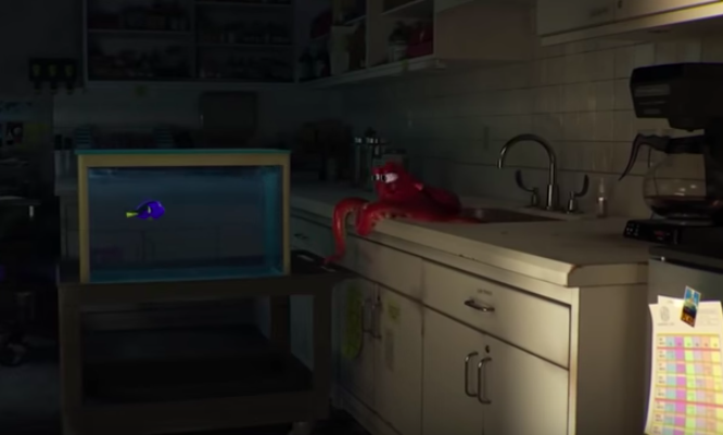 Everyone who has seen Finding Nemo will remember Darla, the young girl who terrorizes the fish in the dentist’s office. Well, she makes a brief appearance in this film as well, this time in the form of a photograph. It can be seen on the wall in the background when Dory first meets Hank.