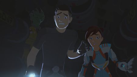 On the season premiere of Star Wars Resistance, after being launched into space by Kaz and crew, the Colossus encounters engineering problems, which are made worse by a mysterious stowaway.