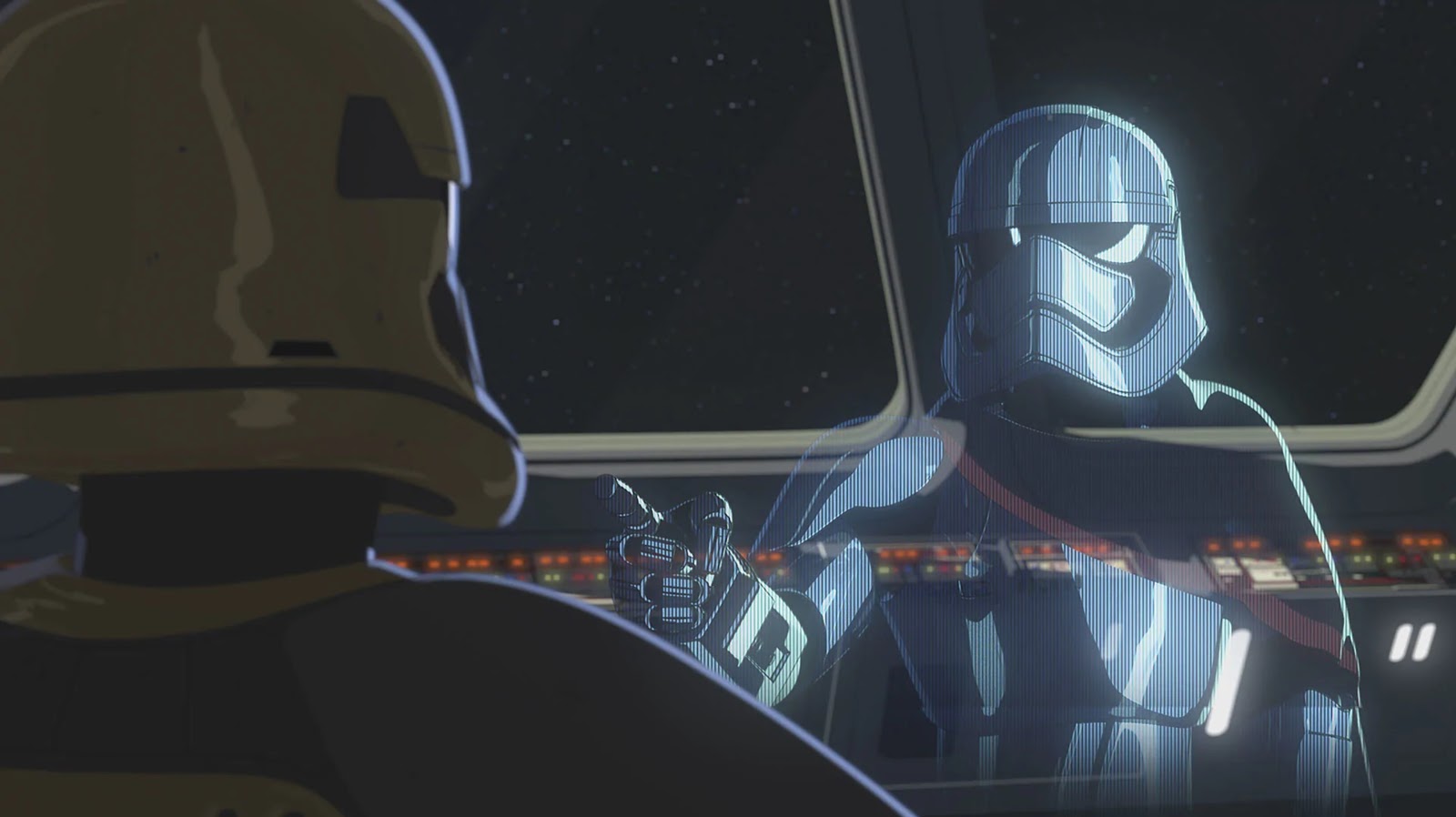 At the beginning of “Into the Unknown,” we see the leftover wreckage from the battle on Castilon and pan up to a First Order Star Destroyer, where Captain Phasma (Ellen Dubin, taking over from Gwendoline Christie) is delivering a message to Commander Pyre (Liam McIntyre) via hologram transmission-- she wants the Colossus found before General Leia Organa’s forces can get her hands on that valuable fuel (this episode must take place between the destruction of the Hosnian system’s Republic core in Star Wars: The Force Awakens and the apparent death of Phasma at the end of Episode VIII.)