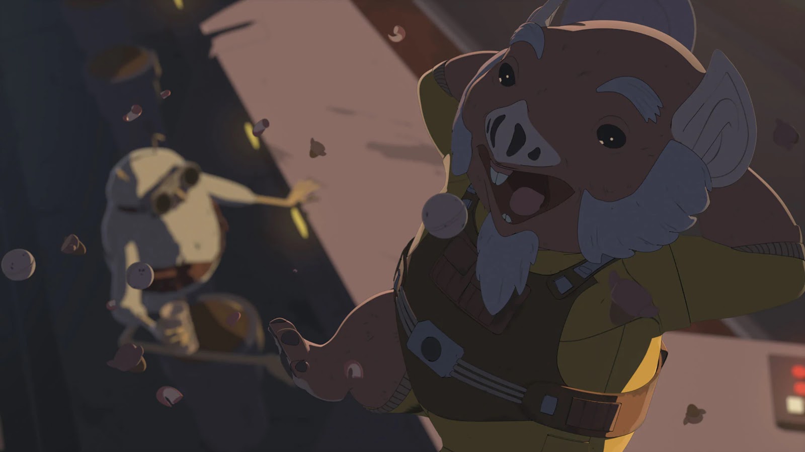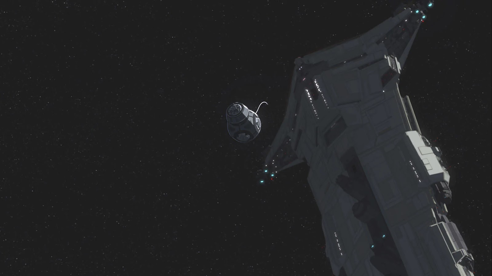 Back at the First Order, new recruit Tam (Suzie McGrath) agrees to help the bad guys locate her former friends in exchange for her becoming a cadet pilot. And on the Colossus, something is stalking CB and Neeku in the air vents, in an obvious homage to Ridley Scott’s Alien-- it’s First Order droid MB-13A, who looks and acts pretty much just like BB-9E from The Last Jedi to me. The evil BB unit accesses the communications relay and is this close to informing its nefarious bosses about the location of the Colossus when the gang works together to knock it out of the airlock, further solidifying the Alien tribute.