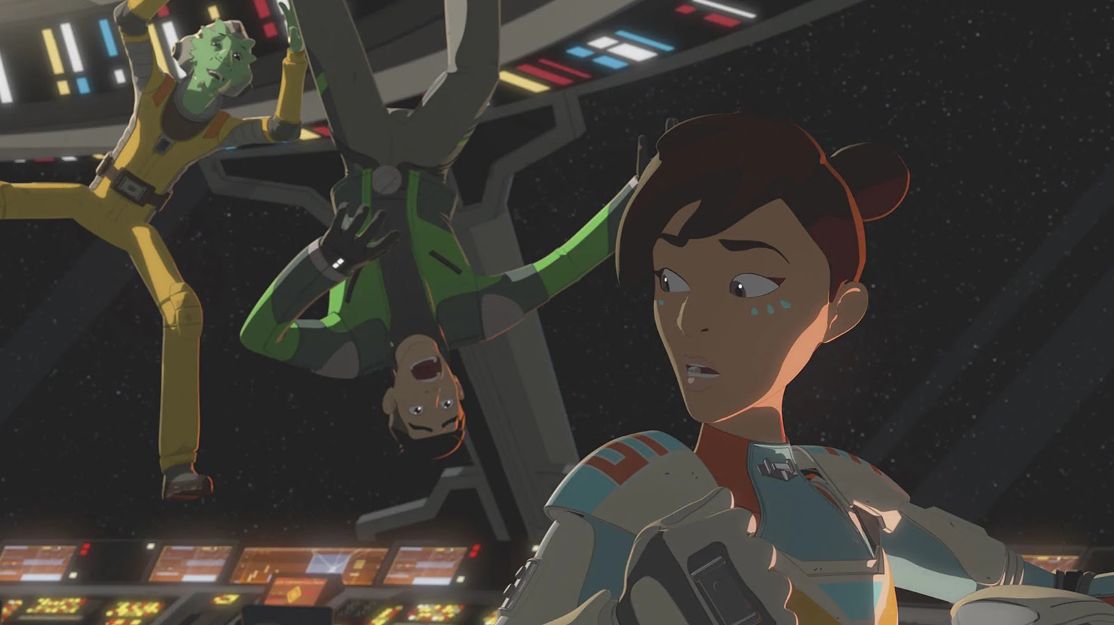 Meanwhile, the Colossus comes out of Hyperspace near D’Qar but not close enough to make contact with the Resistance, as the long-range comms are down-- not to mention the station’s gravity generators. Kaz (Christopher Sean), Neeku (Josh Brener), Torra (Myrna Velasco), and CB-23 volunteer to venture into the bowels of the ship to make repairs before the fluctuating gravity causes any injuries, but the patrons in Aunt Z’s tavern seem to be having fun with the situation.