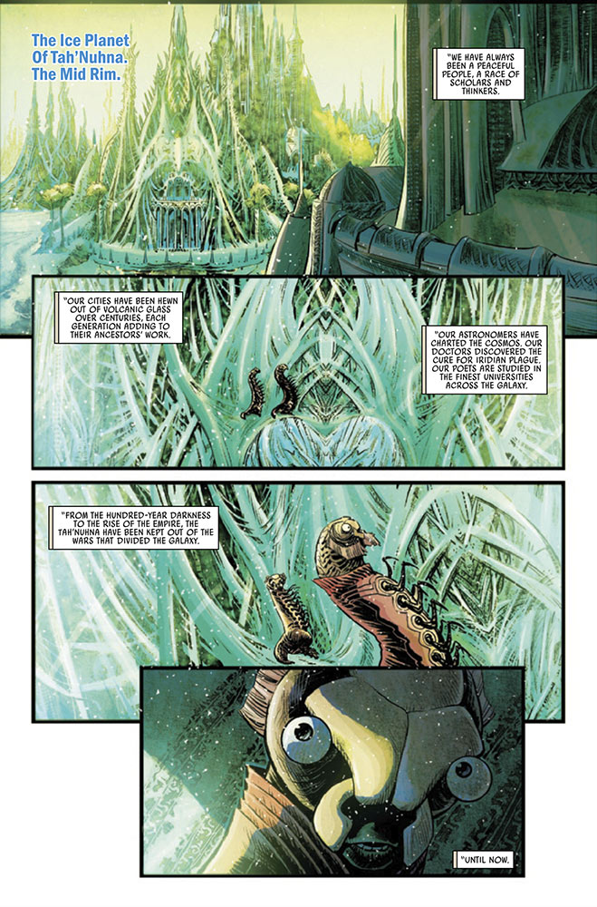 And so Leia, Rose Tico, and Rey take the Millennium Falcon to Mon Cala in the hopes of reassembling old allies. Meanwhile, Finn and Poe Dameron are visiting the Wayward Comet refueling station in search of a cache of weapons the New Republic once confiscated from a band of pirates, which will, as Finn says, “give the Resistance a fighting chance against the First Order.” Along the way they are spotted by the shapeshifting Clawdite Remex Io, who (along with the Kendoh Gang previously featured in Marvel’s Star Wars: Galaxy’s Edge series, which actually takes place after Allegiance) calls in General Hux to claim the bounty on Finn’s head.