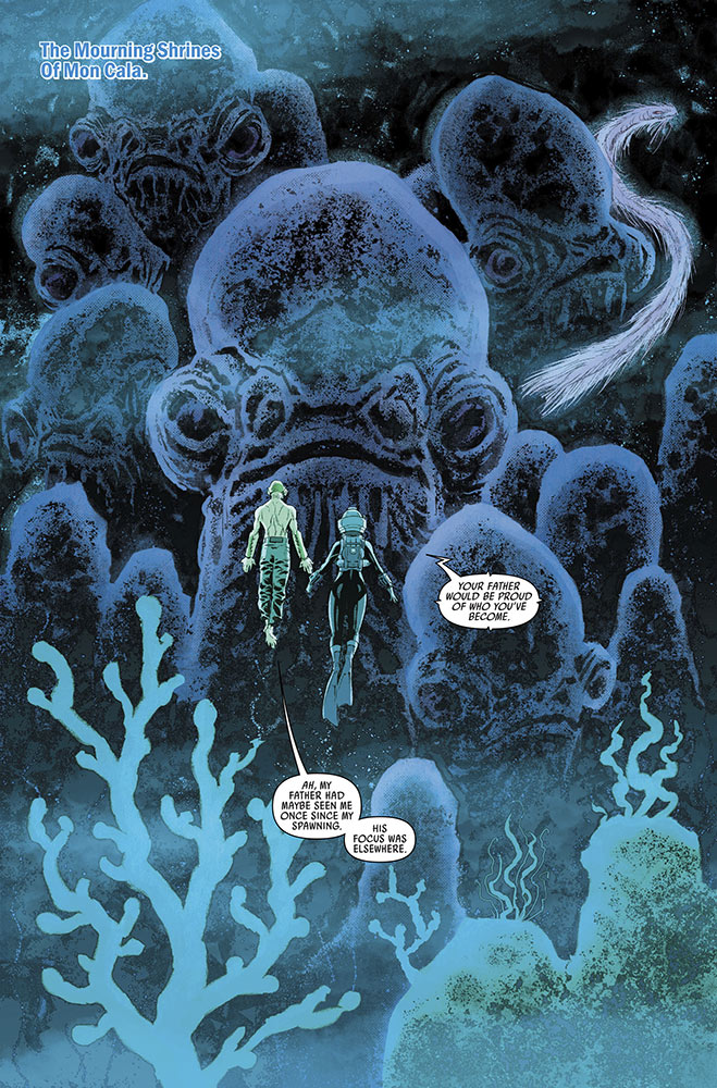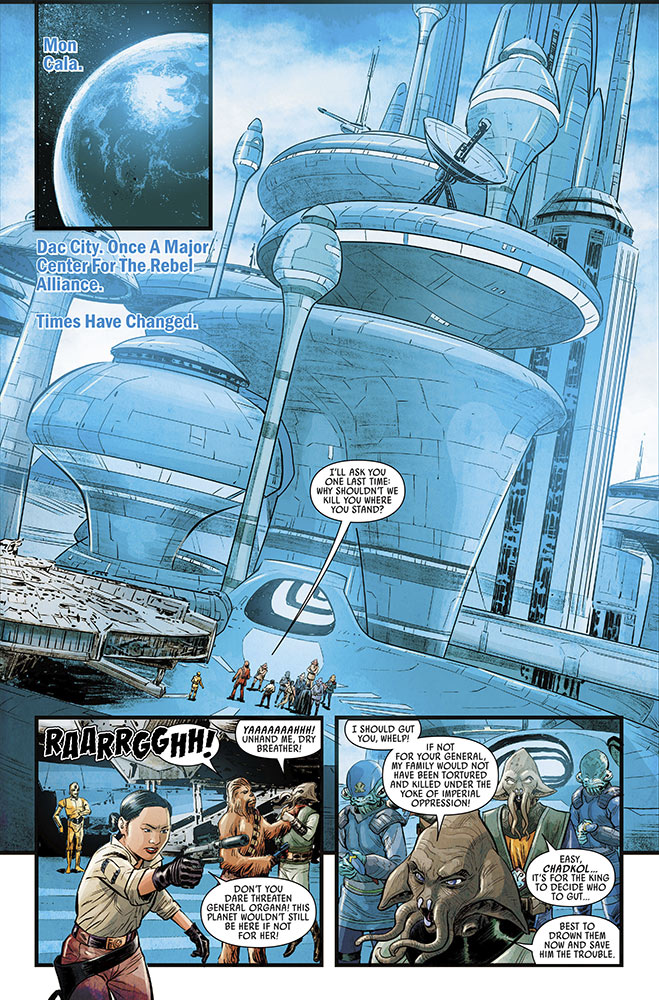 In this installment, we pick up where issue #1 left off with General Organa, Rey, Rose Tico, and C-3PO arriving on Mon Cala in search of reinforcements for the Resistance, though they are only met with suspicion and hostilities-- especially from the Mon Calamari’s sister species the Quarren. It seems the residents of this planet (once a key Rebel Alliance stronghold) have grown bitter due to hardships they’ve faced after decades of war, not to mention the recent loss of local hero Admiral Ackbar.