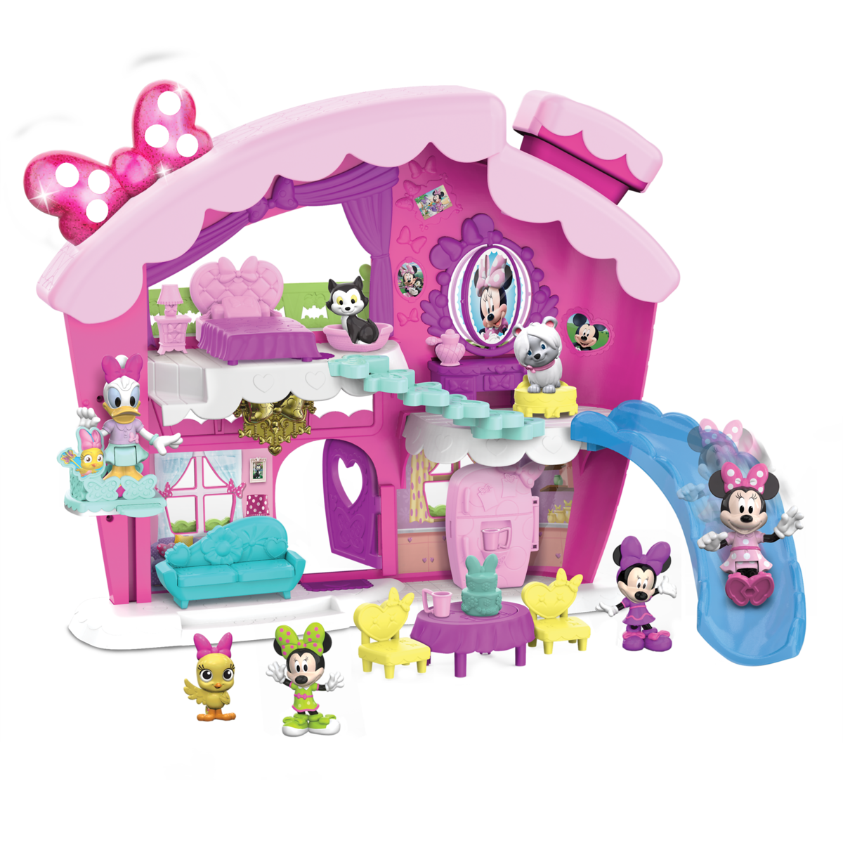 This two-level, two-sided playset features a twinkling rainbow-colored light and sounds bow. Minnie fans will love using the furniture to customize and decorate her home. There are so many surprises inside! Step on the doormat to “magically” open the front door, take the kid-powered elevator to the 2nd floor and flip the dining room tabletop to reveal delicious looking snacks! Minnie’s vanity table also features a fun, kid-powered spinning mirror! Of course, no visit to Minnie’s home is complete without a ride down the slide! Set includes an articulated 3” Minnie Mouse figure, articulated 3” Daisy figure, Figaro figure, and lots of fabulous furniture and accessories to create a bowtastic experience!
