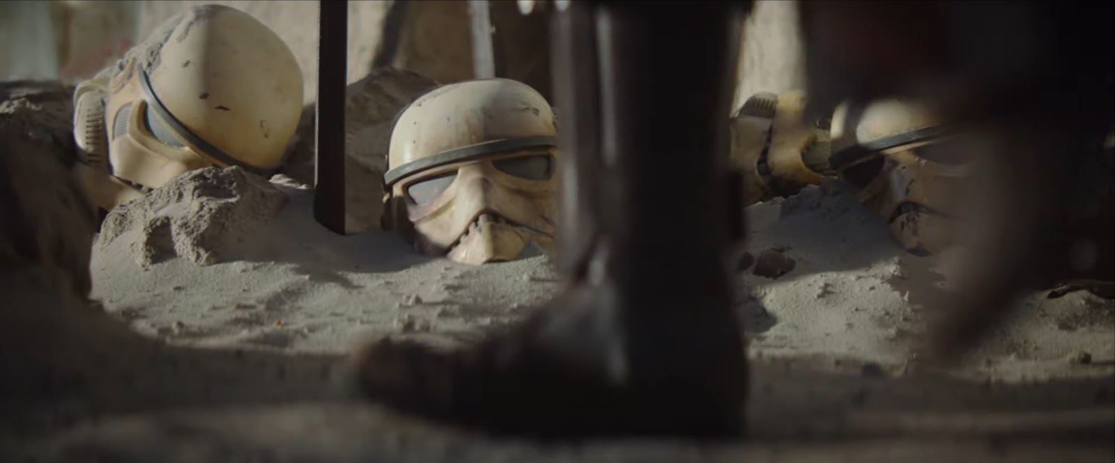 The exact same shot that opened the previous trailer, which is honestly just a little bit disappointing. A collection of sun-battered Imperial stormtrooper helmets lie scattered in the sand. We slowly zoom in until a foot enters into frame and walks through. The music is a little different this time… somewhat more ominous.