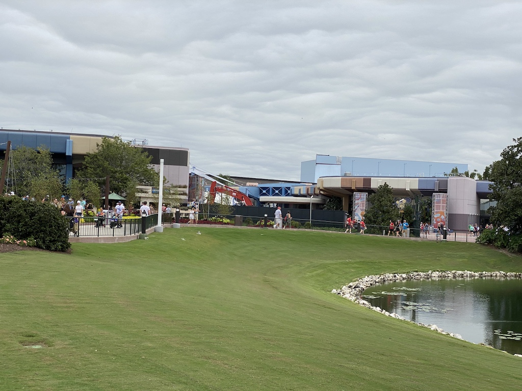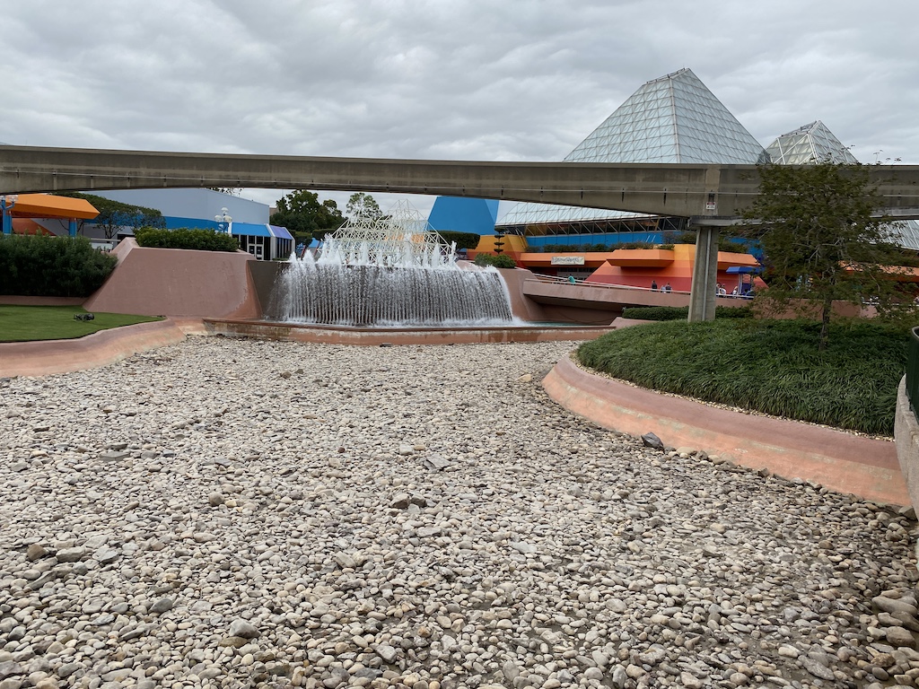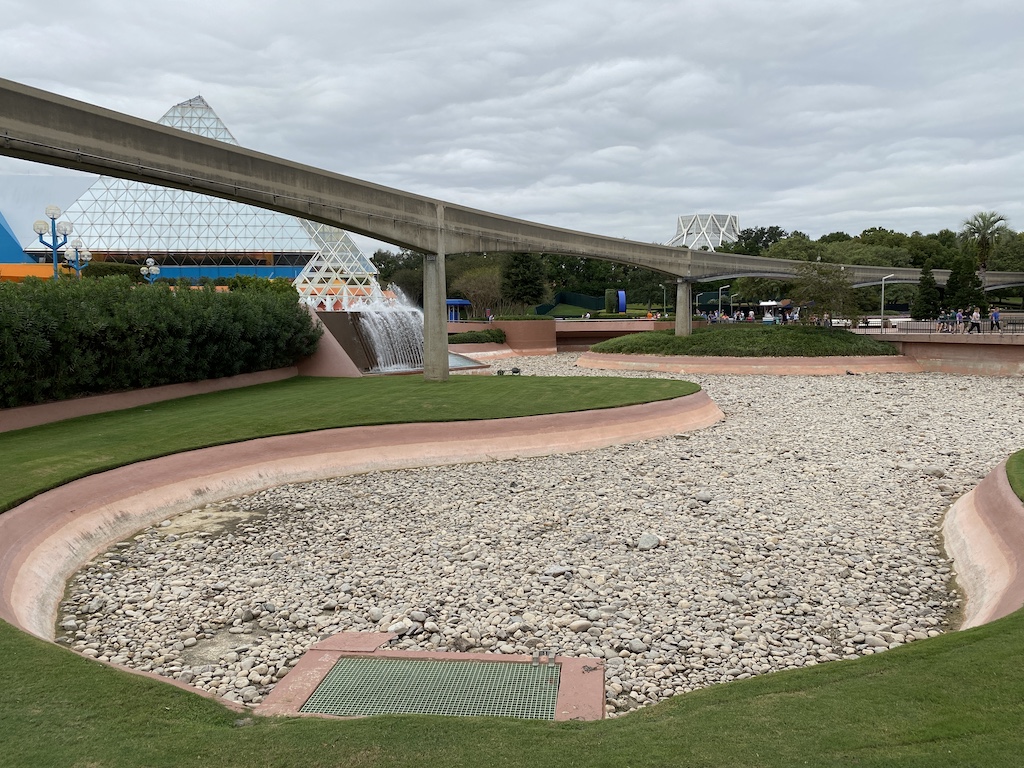 The ponds outside of the Imagination Pavilion have been drained and filled with rocks during construction.