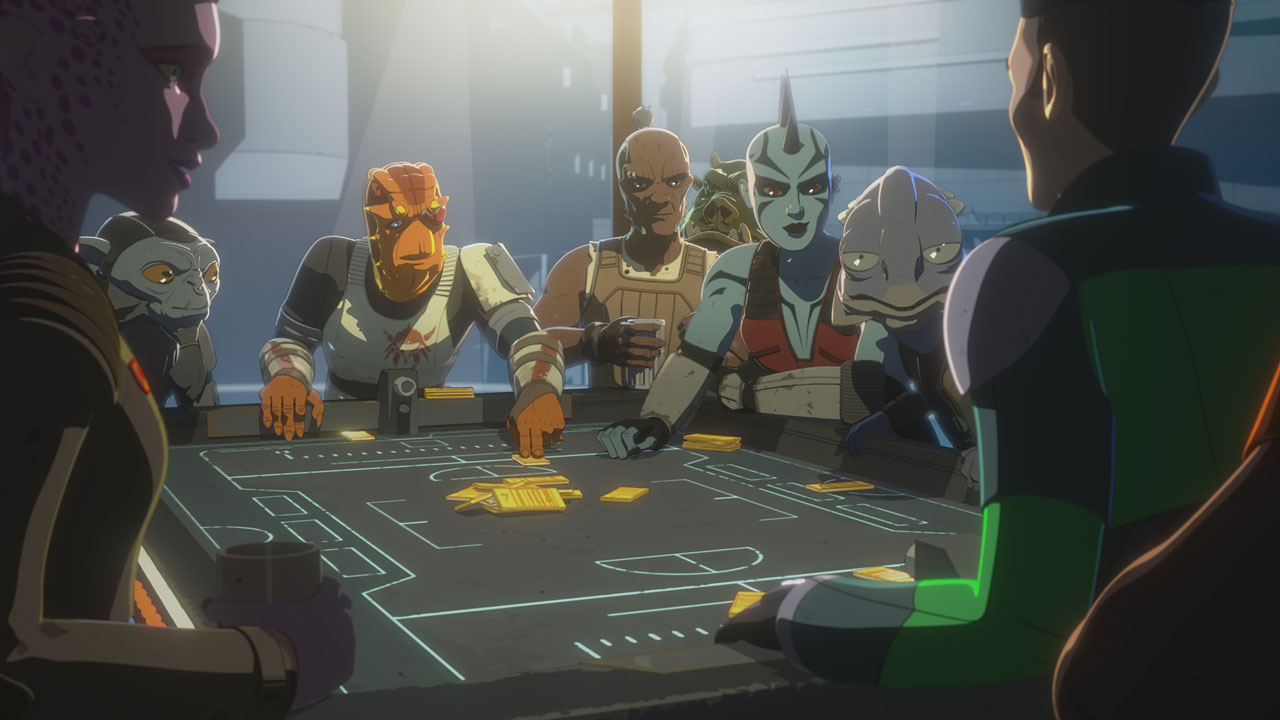 “Kaz’s Curse” begins with Kazuda Xiono (voiced by Christopher Sean) gambling with the pirates aboard the Colossus. He’s having an unusual streak of good luck until one of the buccaneers named Leoz (voice actor Steve Blum of Star Wars Rebels fame) gets fed up with Kaz’s repeated winnings and puts a curse on the young Resistance spy.