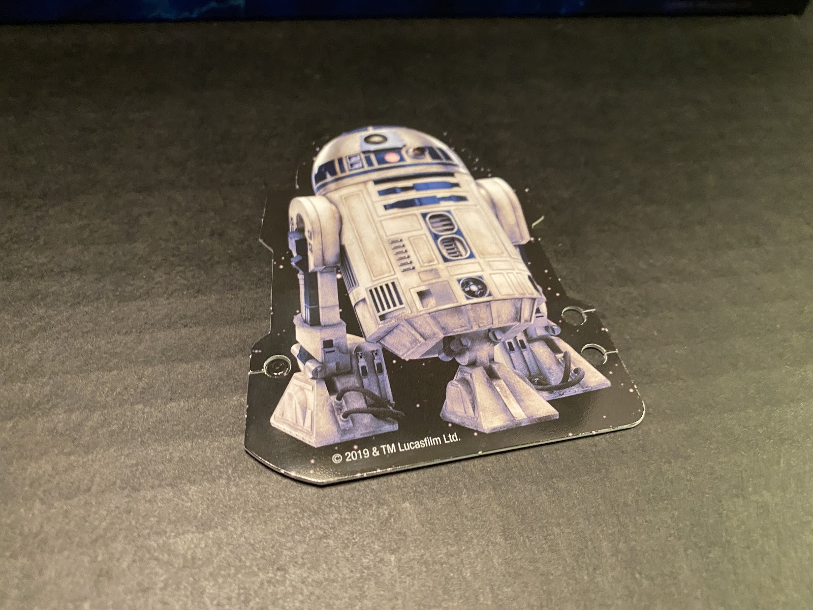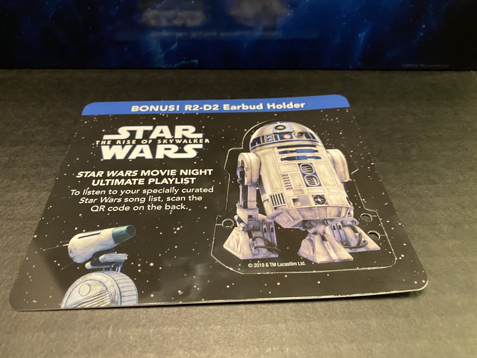 R2-D2 is now your earbud’s best friend as a plastic earbud holder with prongs to hold the ends of the cable, which can warp around it. It’s not so useful if you’re already using wireless earbuds, but if nothing else you can use the QR code to access the “Star Wars Movie Night Ultimate Playlist.”