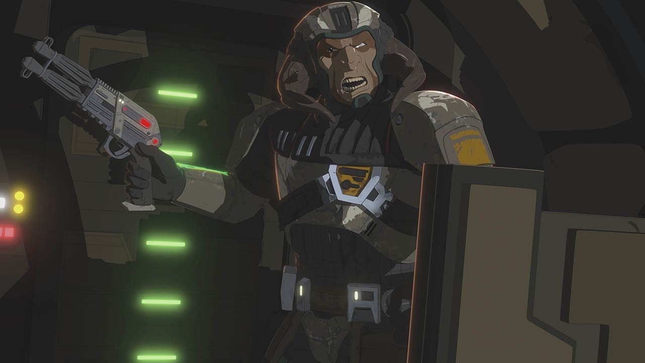 Aboard the Colossus, Kazuda Xiono (Christopher Sean) picks up the distress call, but Captain Doza (Jason Hightower) says it feels like a trap. But Jarek Yeager (Scott Lawrence) backs Kaz’s desire to check it out, so he and Synara San (Nazneen Contractor) join him on an expedition down to Vargo Spaceport with droid CB-23. On their way to the spot where CB is honing in on the signal, they’re spotted by a Gran shopkeeper named Lechee (former Saturday Night Live cast member Fred Armisen) who turns out to be an informant for Ax.