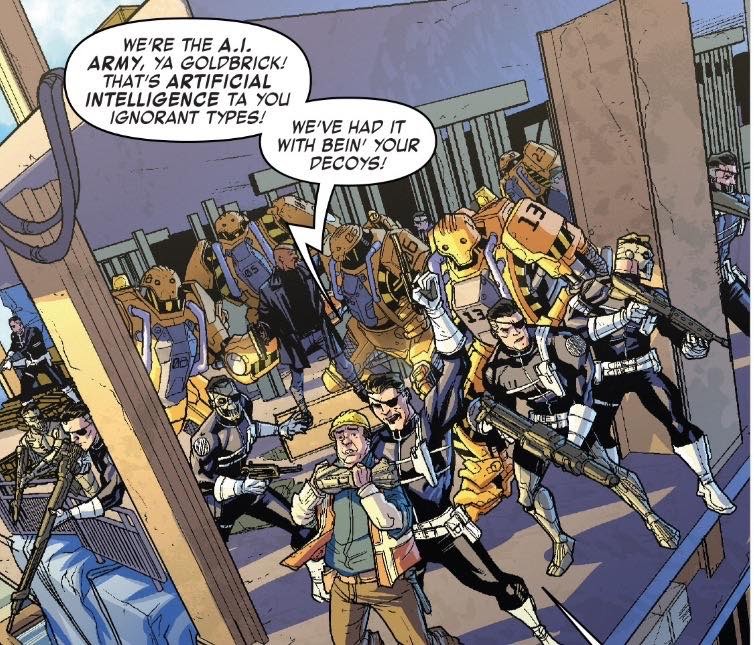 As I alluded to, it does seem as though the robot revolution could become a more serious part of the series in future issues, which could be a good thing. However, there were also some things I don’t like about this. For example, the robots refer to humans as “the meat” or “meatbags” numerous times. At one point they even refer to other robots as “metalheads.” After a while, it starts to get a bit cringey.
