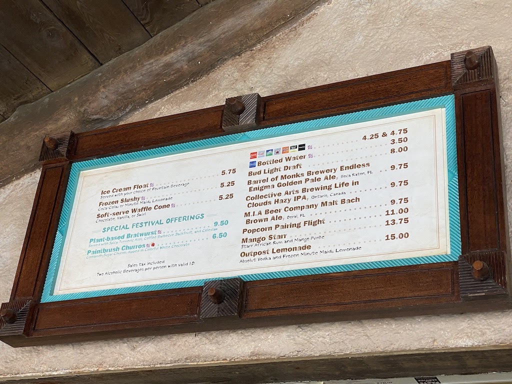 We found these sweet treats at the Refreshment Outpost located between the China and Germany Pavilions in World Showcase. The snack is described as “Cinnamon-sugar churros dipped in colorful white chocolate” and they retail for $6.50. Each serving comes with four “paint brushes” dipped in pink, red, purple, and blue colored white chocolate.