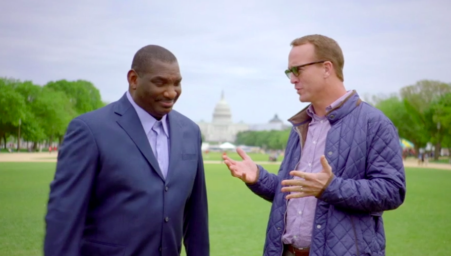 Next, after briefly touching on the game’s increase in popularity, Peyton jumps ahead nearly 20 years to discuss Super Bowl 22 with former Redskins quarterback Doug Williams, the first African American quarterback to play in and win a Super Bowl.