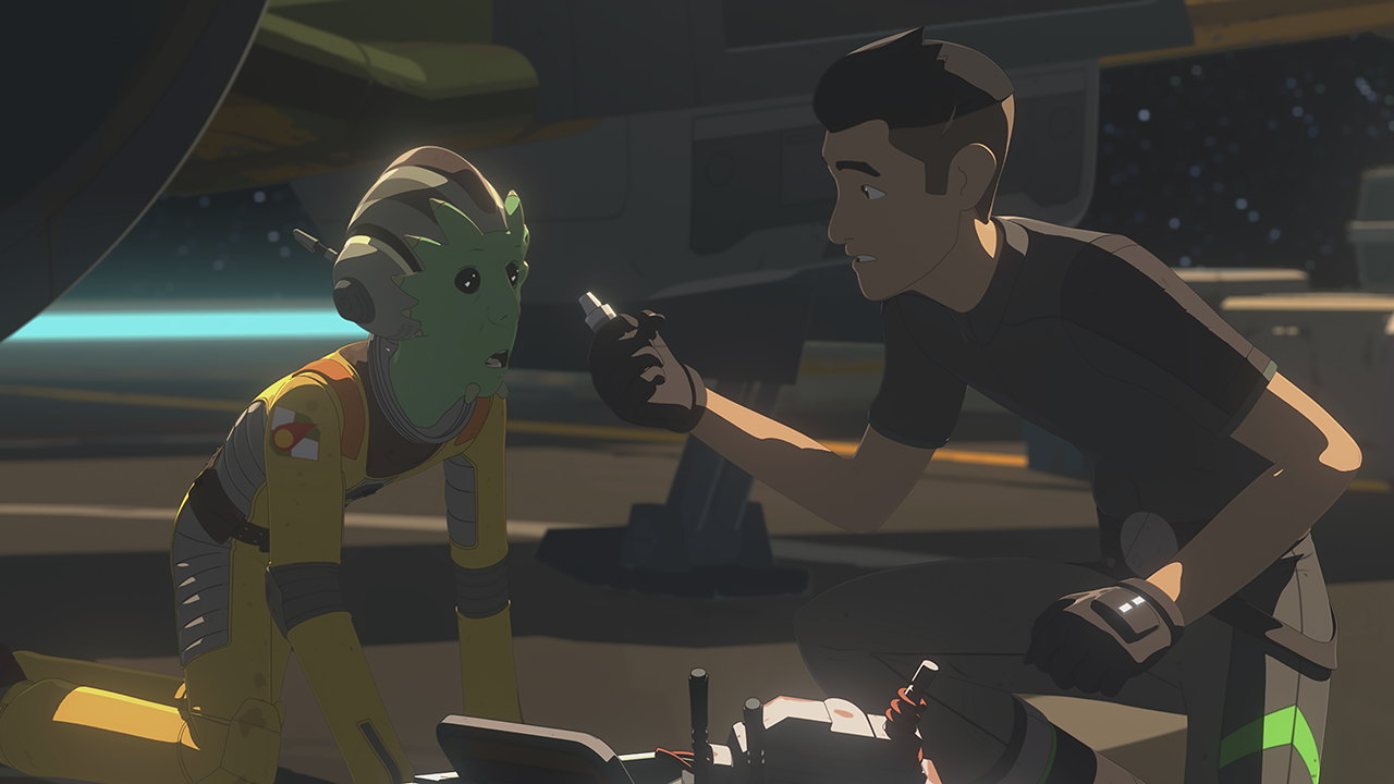 Tam uses the Mouse Droid to recover her communicator from Tierney’s office and then to send a signal to the Colossus, where Kaz, Neeku (Josh Brener), and Yeager are repairing the Fireball when the message comes in. Neeku immediately recognizes it as being in a secret code he had created with Tam in order to mock Kaz’s poor mechanic skills, and they interpret it as a request to meet on Castilon. Captain Doza thinks it may be a trap, but after Venisa convinces him to let them go, Kaz and Yeager take the captured First Order shuttle. Meanwhile, Agent Tierney has begun to suspect Tam and assigns Rucklin to watch over her. Tam uses a training exercise as an excuse to jump to Castilon, where Kaz and Yeager have landed on an abandoned racing ring, and Tierney finds the communicator missing from her office, confirming her suspicions.
