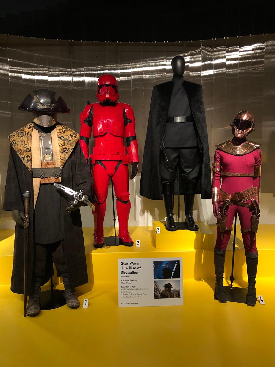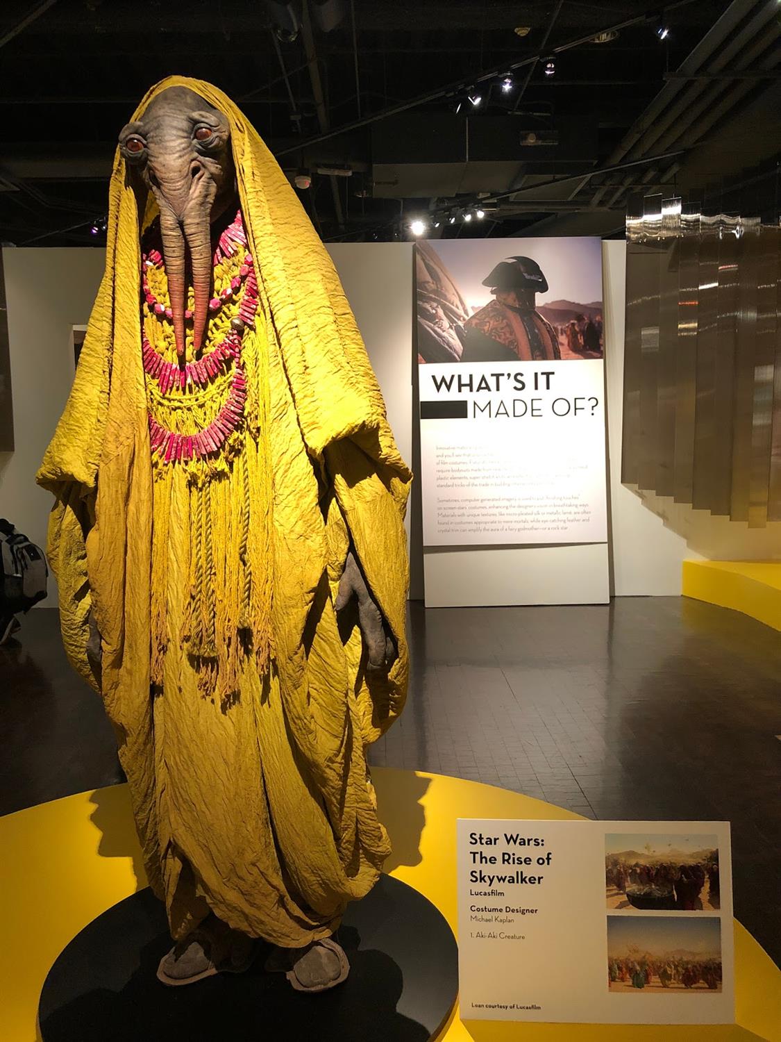 And from A Galaxy Far, Far Away I saw costumes for the characters of Allegiant General Pryde (played by Richard E. Grant), Zorii Bliss (Keri Russell), hermit Lando Calrissian (Billy Dee Williams), a Sith Trooper, and an Aki-Aki creature from this past December’s Star Wars: The Rise of Skywalker.