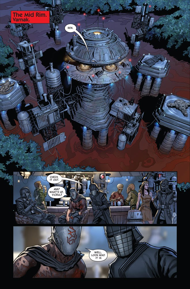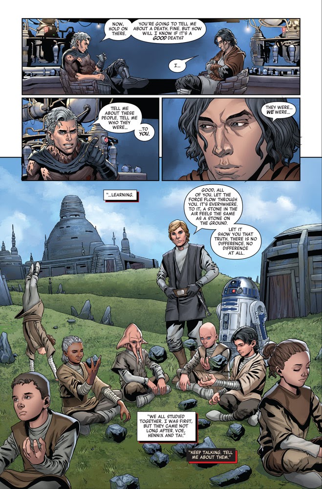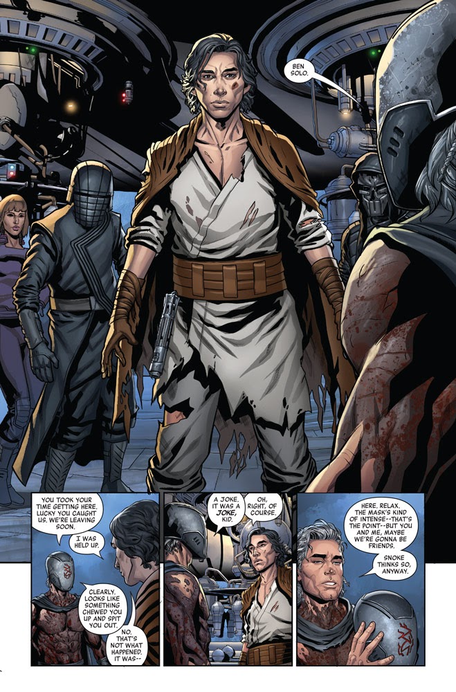 Seeking to cement his place at Snoke’s side and find a new path in the galaxy, Ben Solo has traveled to the planet Varnak in the Mid Rim in search of the Knights of Ren, whose showdown with Luke Skywalker we saw last issue. The knights are intrigued but otherwise unimpressed, and they inform Ben of their initiation ritual: he must cause a death, but not just any death. Ben then relates the tale of how he faced off with three of his former fellow students (namely Voe, Tai, and Hennix-- two humans and one Quarren) on Elphrona, the site of an ancient Jedi outpost.