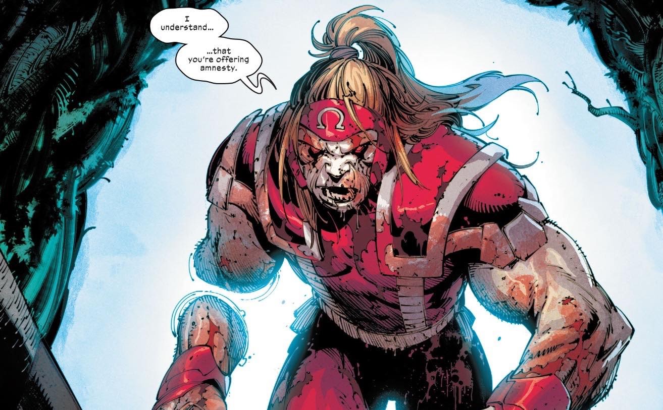 This story, titled “The Catacombs,” wastes no time in bringing Omega Red through one of Krakoa’s gates and Wolverine doesn;t exactly greet him with a friendly reception.