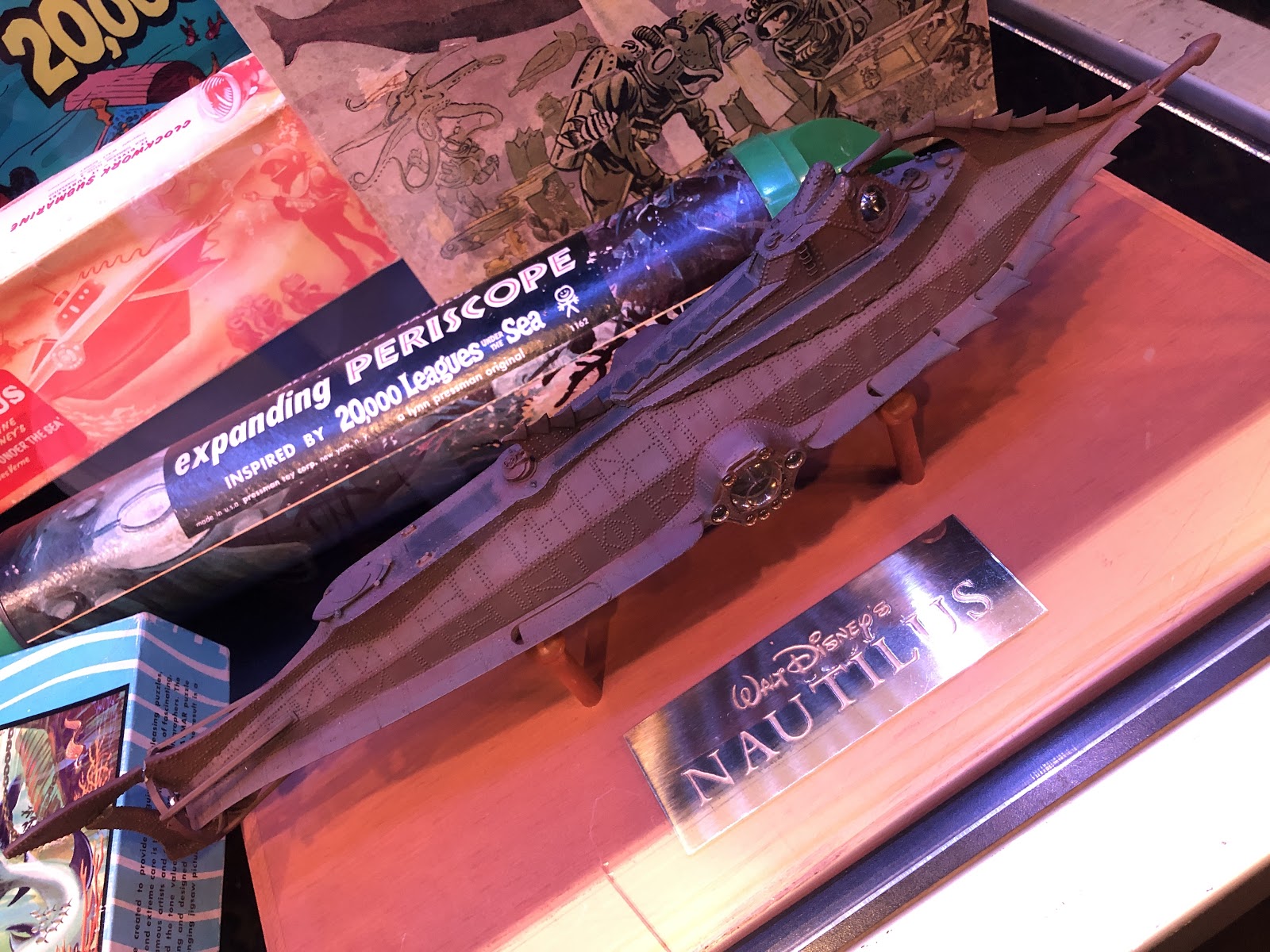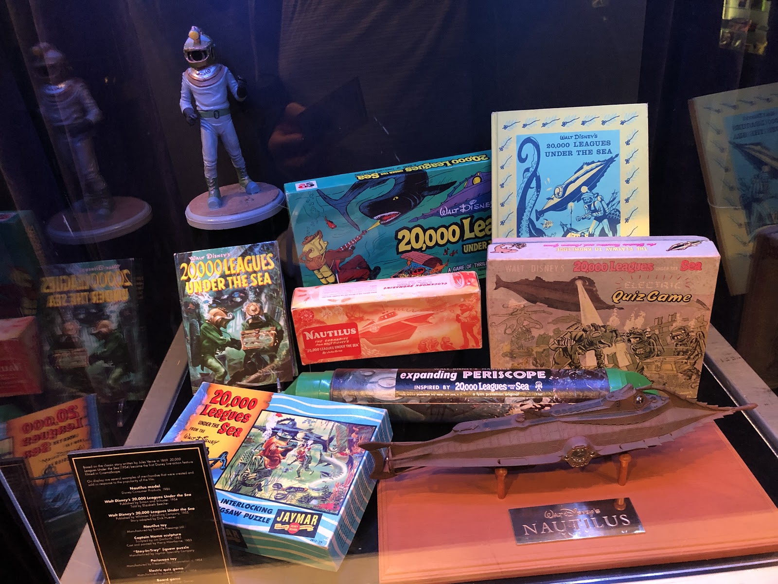 Inside the El Capitan Theatre lobby, a display of 20,000 Leagues Under the Sea memorabilia was on exhibit, featuring a Nautilus submarine model, children’s books, toys, games, puzzles, and a Captain Nemo statue.