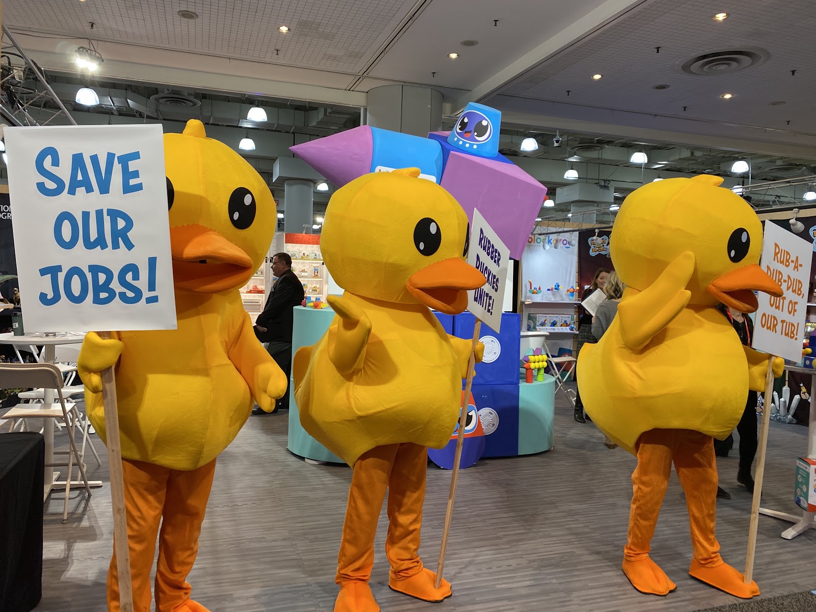While visiting Blue Marble at Toy Fair, we also discovered that rubber duckies may be out of a job. They weren’t happy about it, protesting in front of their booth on the show floor.