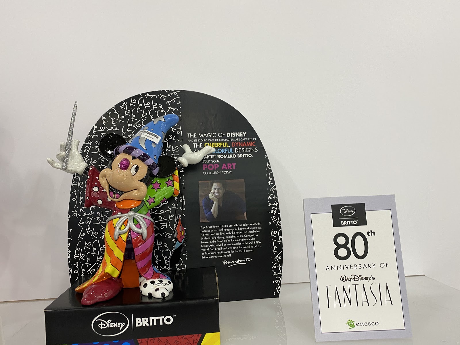 For Fantasia’s 80th anniversary, Jim Shore has created a tall figure with Sorcerer Mickey perched on his rock with translucent water splashing around it, with other characters from the musical package feature around the base.