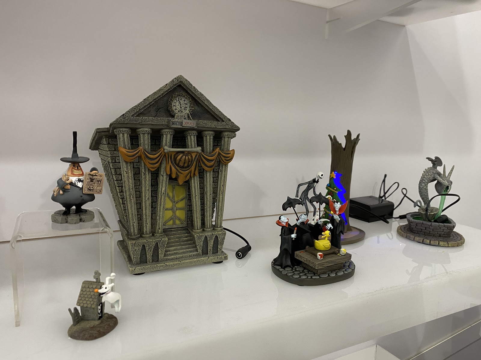 Enesco’s line of light-up holiday houses adds Halloweentown to the mix this fall with the courthouse from The Nightmare Before Christmas and new character figures, like the puking town fountain and the vampire trio making a fanged duck toy.