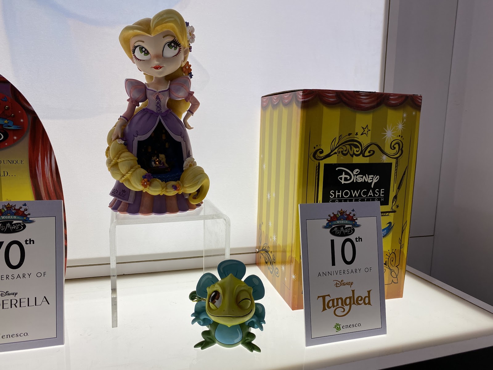 For the 10th Anniversary of Tangled, a similar collectible features Rapunzel with the floating lanterns scene inside her dress. She pairs well with Pascal, who has changed colors to look like a flower.