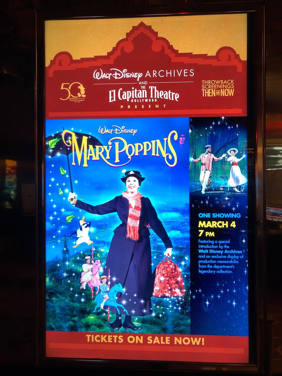 Southern California Disney fans had a Supercalifragilisticexpialidocious evening at El Capitan Theatre last week when The Walt Disney Archives hosted a special screening of Walt Disney’s original Mary Poppins as part of the archives’ 50th anniversary celebration, complete with a historical presentation and a display of memorabilia from the film.