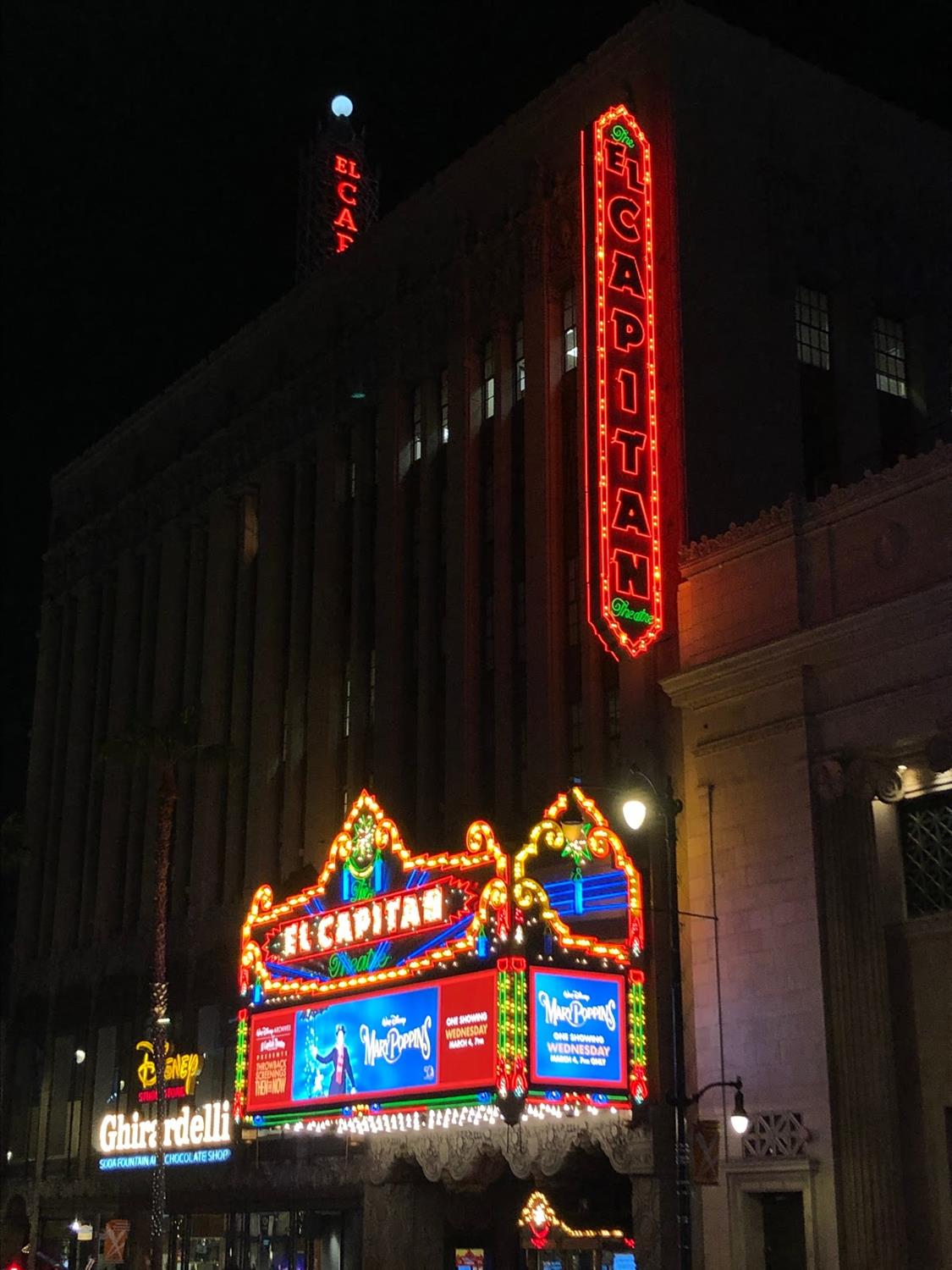 In the lobby of the historic El Capitan, a small exhibit of items from the production and promotion of Mary Poppins was on hand for the enjoyment of guests in attendance, including the hat worn by megastar Julie Andrews (who played the title character) in the film. There was also the 1964 Grammy Award won in the category of Best Recording for Children, ephemera from the movie’s world premiere at Grauman’s Chinese Theater (just across the street from El Capitan), and other interesting pieces.
