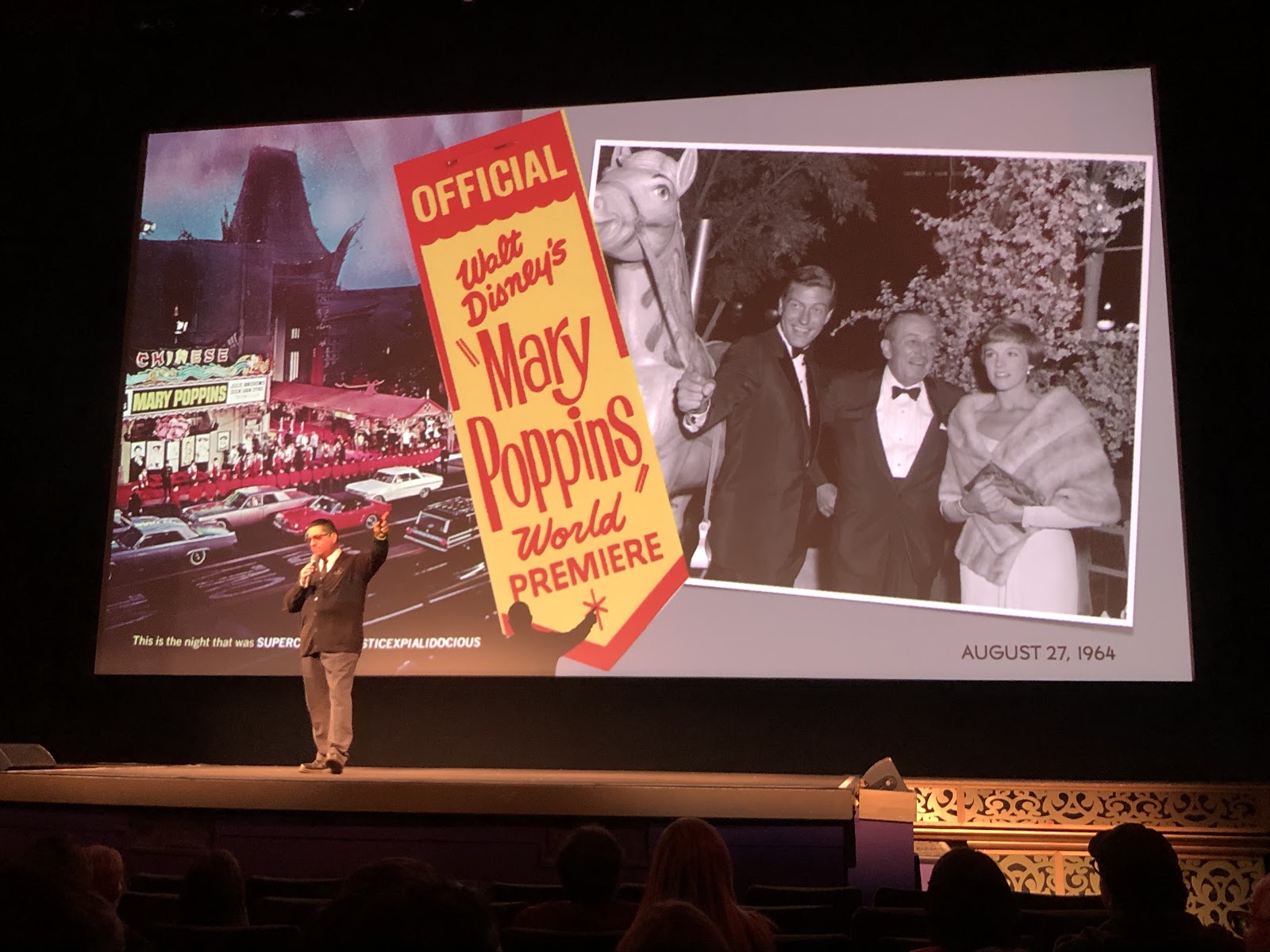 Prior to the main attraction, a representative from The Walt Disney Archives came onstage to give a slideshow presentation about the behind-the-scenes artifacts from Mary Poppins in the archives’ collection. We learned more about the Sherman Brothers and how they composed the film’s music for Walt, the soundstages where Cherry Tree Lane and other locations were built on the Walt Disney Studios lot in Burbank, and the function of The Walt Disney Archives itself-- the latter of which was instrumental in preserving props such as the famous snow globe from Mary Poppins.