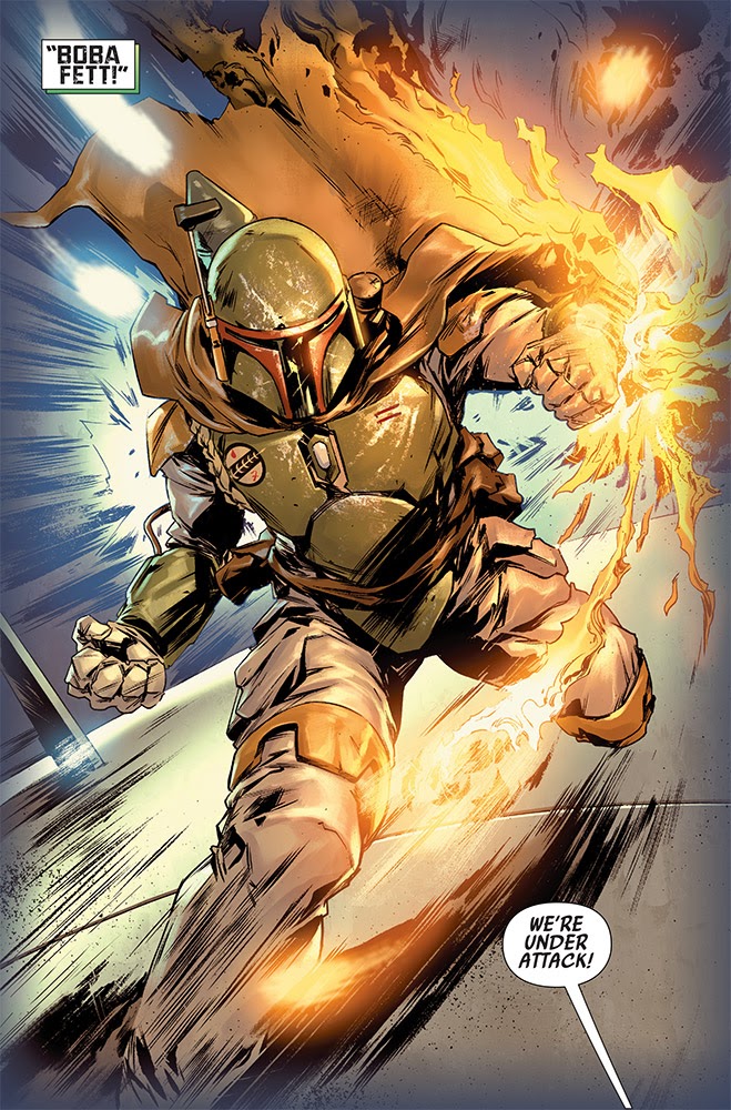 Writer Ethan Sacks (Star Wars: Galaxy’s Edge, Star Wars: Allegiance) introduces a lot of ideas and characters in this first issue of Bounty Hunters, not to mention reintroducing familiar ones. It seems the main three characters of the series (or at least this initial arc) will be Boba Fett, Bossk, and Valance the Hunter-- the latter of which was recently carried over from the abandoned continuity of Marvel’s original Star Wars comic run in the pages of Star Wars - Han Solo: Imperial Cadet and Star Wars - Target: Vader. We also meet some fresh faces and visit some recognizable locations, including a certain Outer Rim outpost currently visitable at Disney theme parks.