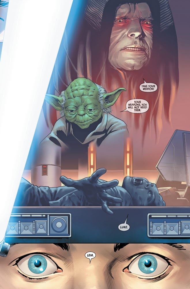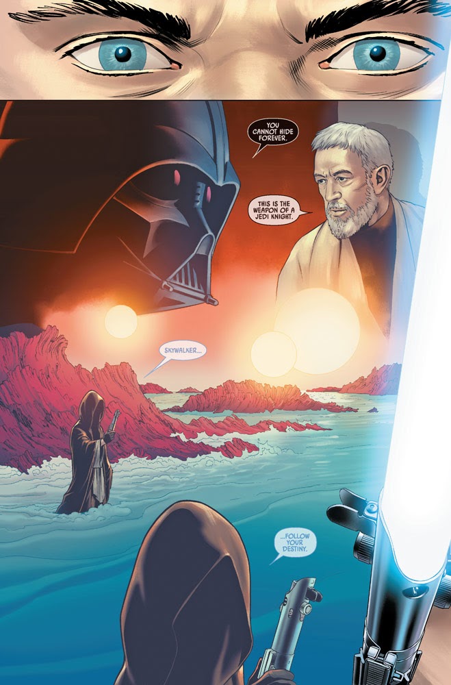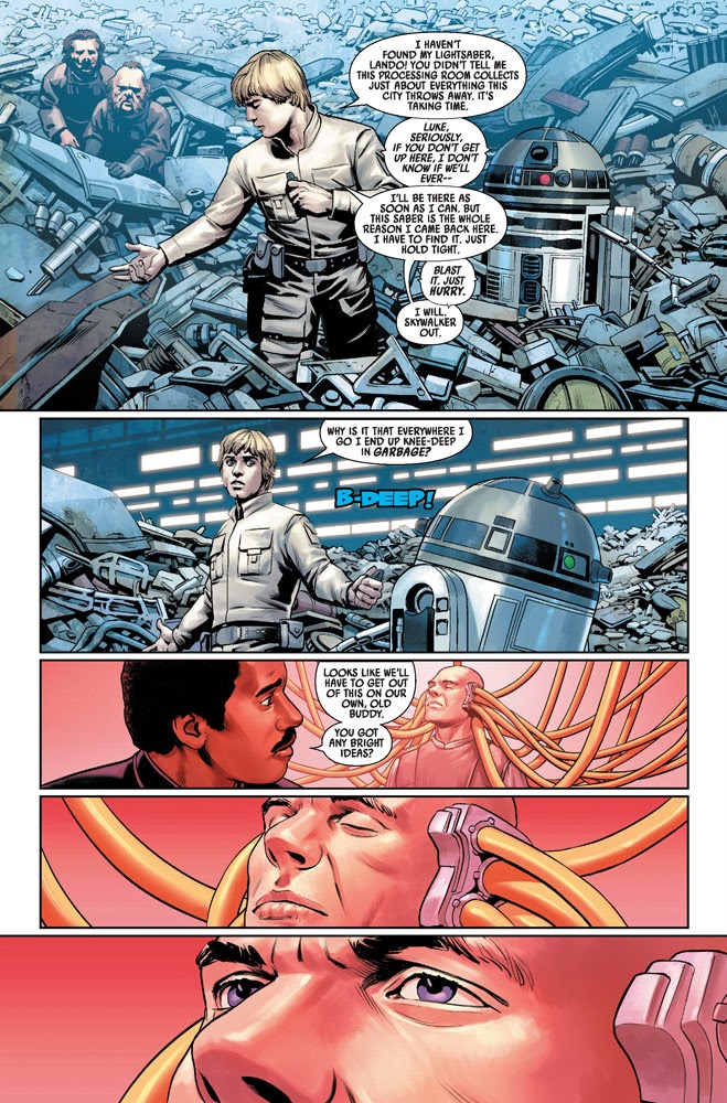 It turns out that the hooded figure we saw catching the saber two months ago is the important part of that image, and that Luke’s vision probably wasn’t a literal one. This installment sees Luke continuing his search through Cloud City’s trash processing room for his lost weapon, only to have the pursuit culminate in a revelatory reconnection with the Force-- one that convinces him his father’s lightsaber probably isn’t worth obsessing over.