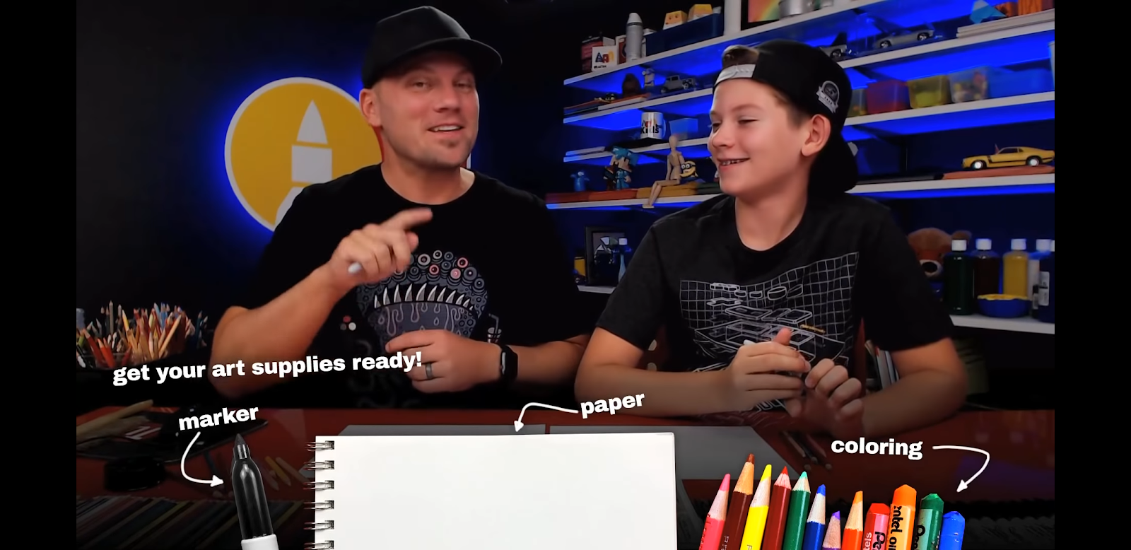 Most of the lessons simply ask that you have a basic black marker to draw the figure and then crayons, markers, etc to color it. As he guides you and his learner through the process, he offers encouraging words reminding all that their creation is special and the goal is to have fun.