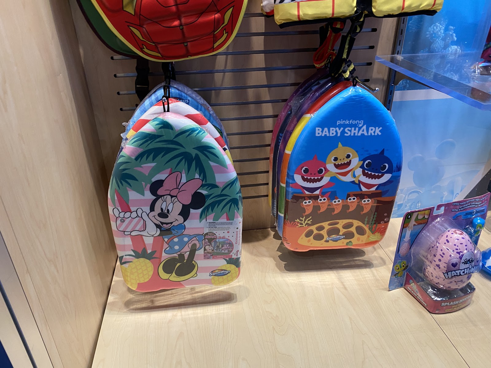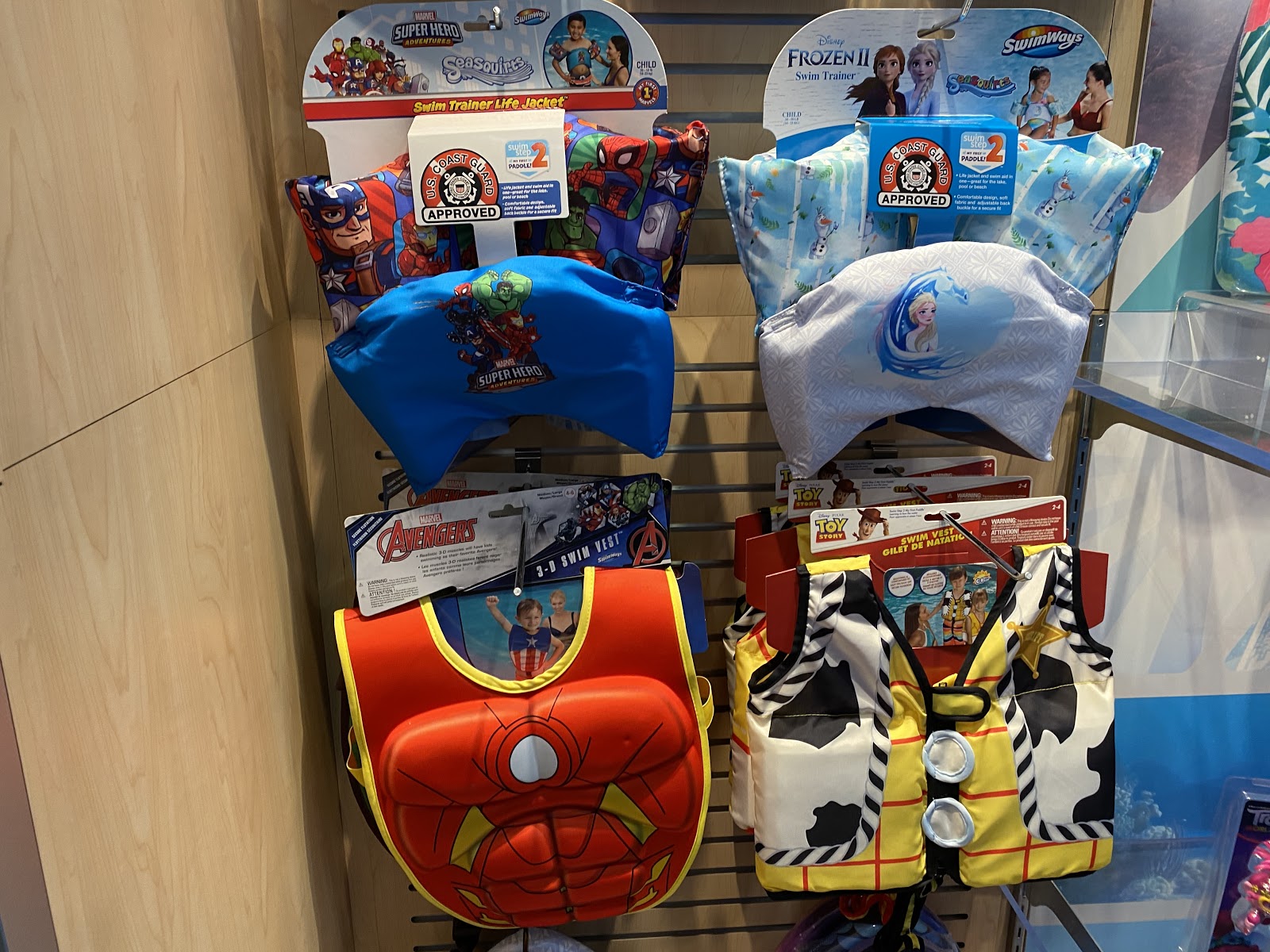 Kids floating vests get upgraded with character themes like Iron Man and Jessie. And Disney themed boogie boards and Ariel’s flippers add even more fun to pool time.