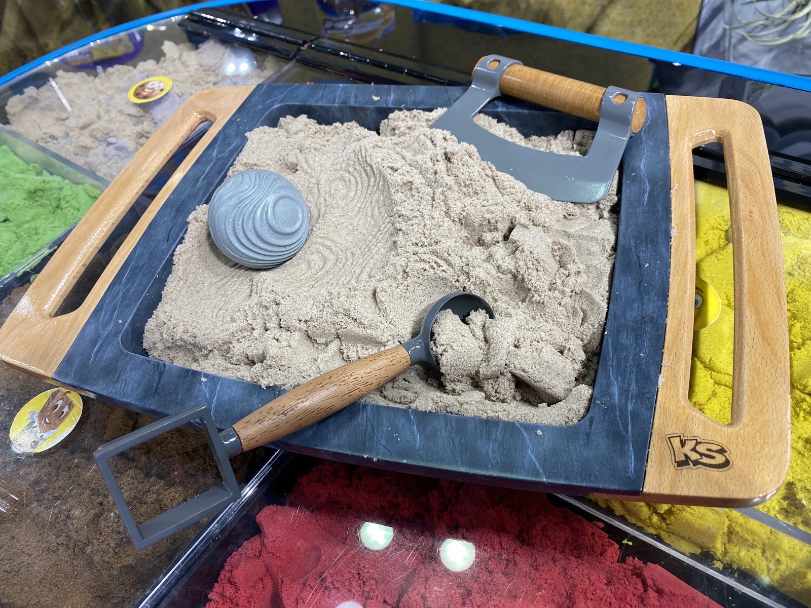 Spin Master knows that adults love Kinetic Sand too and have a new product just for them, Kinetic Sand Kalm. This elegant looking trey is perfect for an office desk and includes several tools to make beautiful designs, as well as a sand cutting tool.