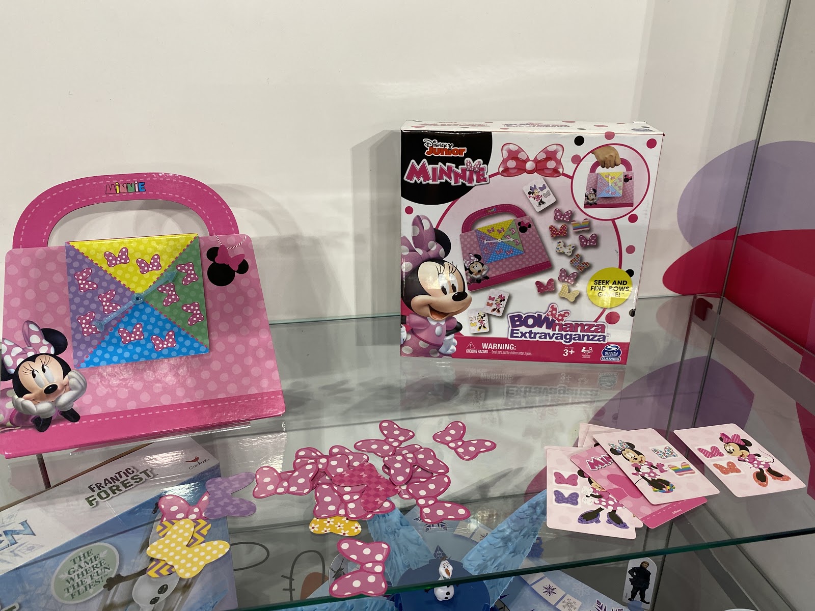 This kid-friendly matching game pairs their love of Minnie Mouse and her signature bow with matching skills. Use a deck of cards to reveal two bows that must be matched to win the card. Then flip over the polka dot bows to try and find the two that match. The game is stored in a Minnie Mouse purse that also acts as a spinner.