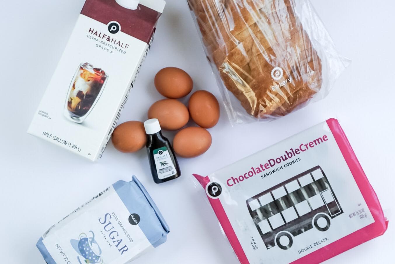 The Disney recipe also provides ingredients for toppings. We cheated a bit and simply used a can of whipped cream. We also skipped out on the drizzle of sweetened condensed milk as the bread pudding is plenty sweet as it is. We did however used the crushed cookies. Here are the ingredients you will need for the toppings as Disney calls for: