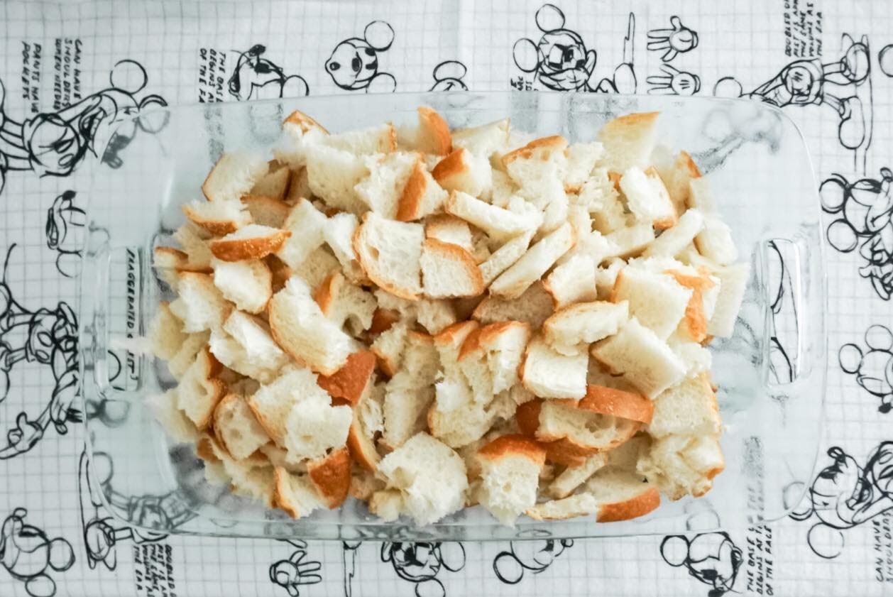 2) Cut bread into one-inch cubes and place in large mixing bowl. Set aside.