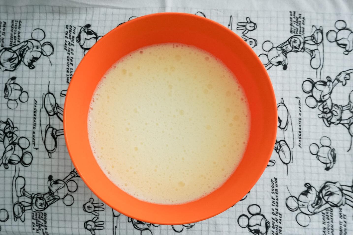3) Combine eggs, sugar, half and half, and vanilla extract in a medium mixing bowl. Whisk until fluffy.