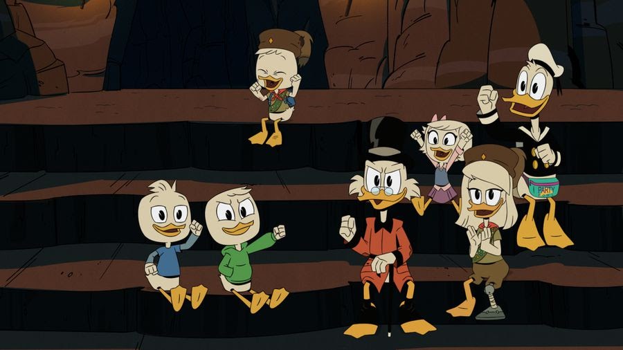 Like the previous two DuckTales season premieres, “Challenge of the Senior Junior Woodchucks!” is packed with hilarious gags and plenty of Easter-Egg references to Disney’s Duck Family’s past which I won’t give away here (okay, I’ll give you one of the more conspicuous examples-- watch out for the very-annoying-to-some Aracuan Bird from The Three Caballeros, who plays a pivotal role in steering Scrooge and his companions on their expedition). Accomplished character actor Stephen Root (Office Space, NewsRadio) guest stars as Huey’s unusual ally and there are also lessons to be learned about earning your accomplishments, letting fate guide you to new experiences rather than rehashing old ones, and just plain being a good sport. Naturally I’m not going to spoil the ending here, except to say that it provides a tantalizing jumping-off point for the episodes to come.