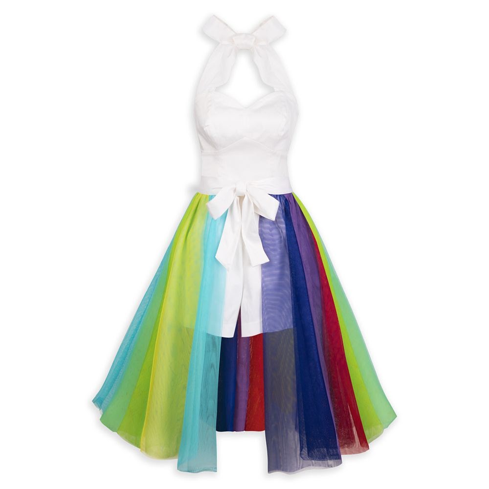 From the Disney Parks Dress Shop Collection comes this white halter top shorts romper with removable layered rainbow skirt made up of sheer panels representing the colors of all the emotions in Disney and Pixar's Inside-Out.