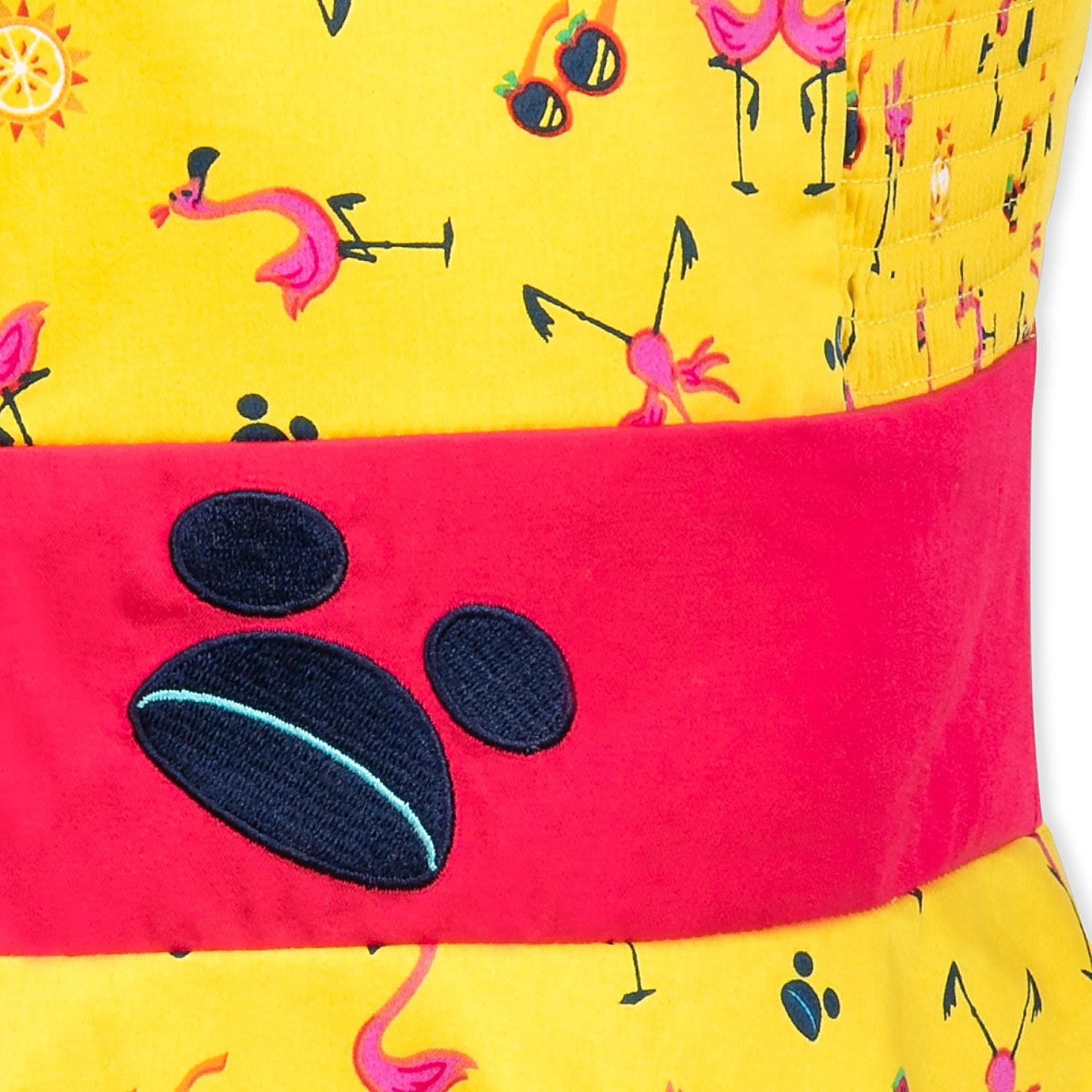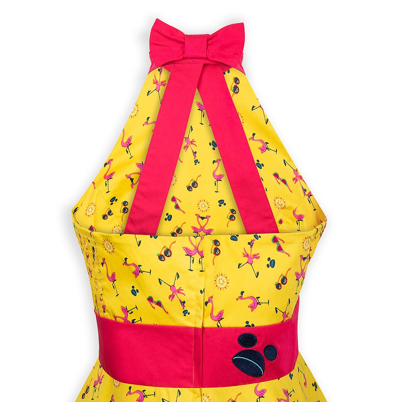 The flock of flamingos on this frock will leave you feeling in the pink while the vibrant yellow color is sure to inspire sunny smiles any time you wear this retro-style halter dress.
