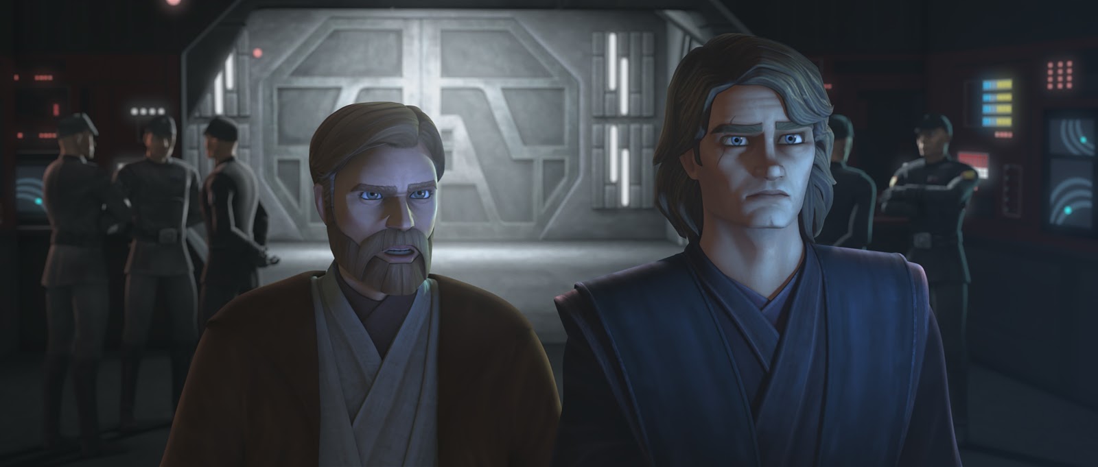 Admiral Yularen (Tom Kane) contacts Anakin and Obi-Wan, saying he’s received a transmission from an agent identifying themself as “Fulcrum.” Anakin thinks it must be Saw Gerrera calling from Onderon, but upon returning to the command ship the signal turns out to have come from his former Padawan learner Ahsoka Tano (Ashley Eckstein). It seems Ahsoka and her Mandalorian associate Bo-Katan Kryze (Katee Sackhoff) have located the rogue Sith Lord Darth Maul (Sam Witwer) and want the Jedi’s help in bringing him to justice. Skywalker is excited by this proposition, but Kenobi remains “cautiously optimistic.”