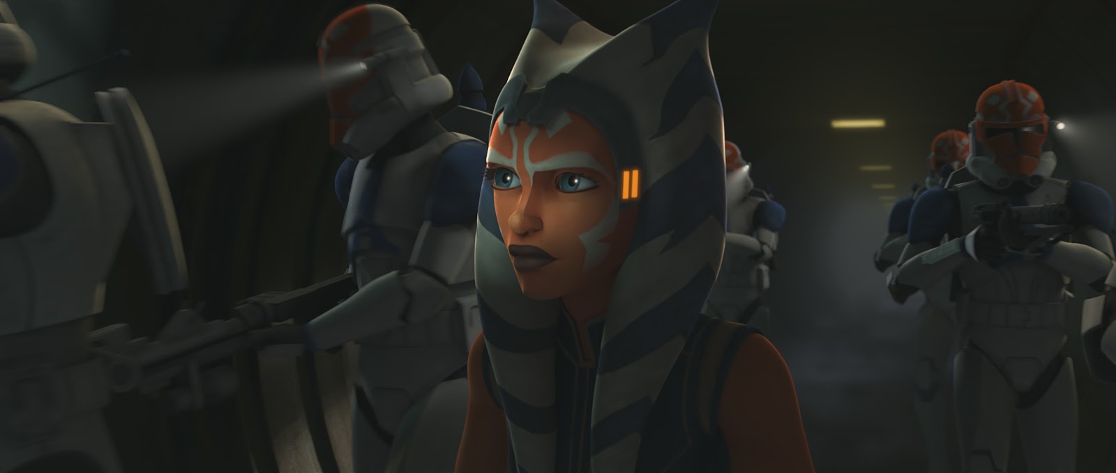At a holotable briefing, Ahsoka and Bo-Katan reveal Maul is hiding out on Mandalore, and they propose a joint operation: the Jedi take Maul and Bo-Katan retakes her home planet. Obi-Wan wishes to consult the Jedi council prior to making any decision on the matter, but Bo-Katan says there isn’t enough time. Obi-Wan refuses to relent, however, and Bo-Katan says to Ahsoka, “I told you this was a waste of time.” As Anakin brings Ahsoka through the halls of the ship, she says the clones shouldn’t salute her anymore, since she’s no longer a member of the Jedi Order, but Anakin knows they still respect her. He brings her to see more troops and Captain Rex, who has painted his helmet to resemble Ahsoka’s facial markings.