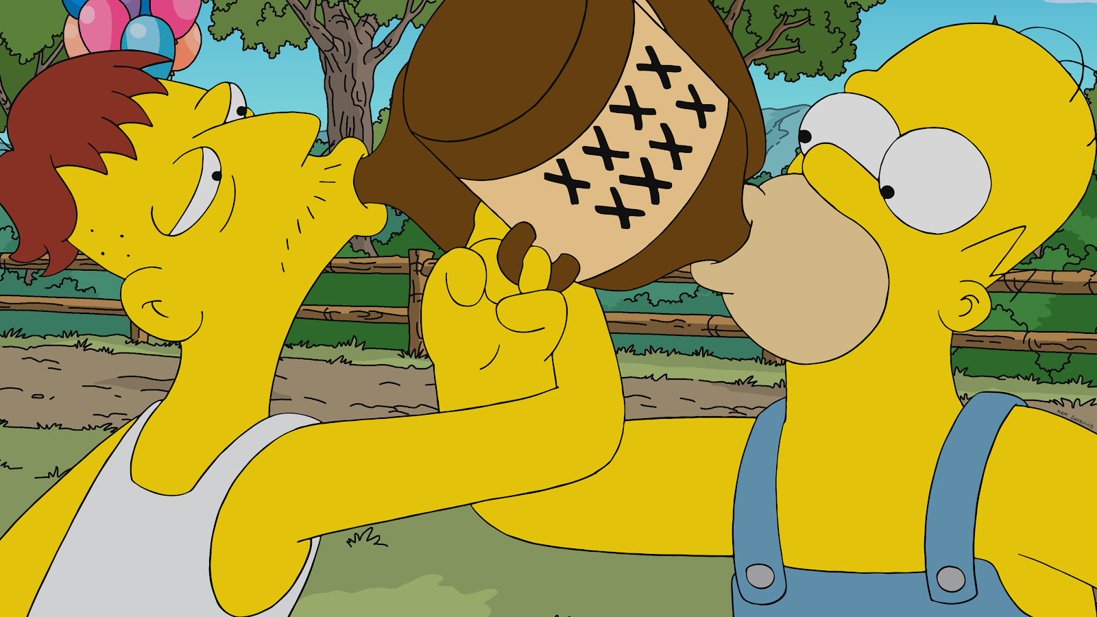 Marge decides to bring Maggie back to Hudson, saying she’s not going to be the villain in this romantic comedy. Meeting back up with Courtney at the fancy park, Marge says, “The one thing we have in common is that we’re willing to pretend we like each other for our children.” Maggie and Huson get baby-married and move into the playground’s plastic house. Then in the coda, Homer and Cletus sing a parody of Queen’s “You’re My Best Friend” through a hanging-out montage while Smithers returns to the balloon stand to buy a still-floating Mr. Burns back and carry him away.