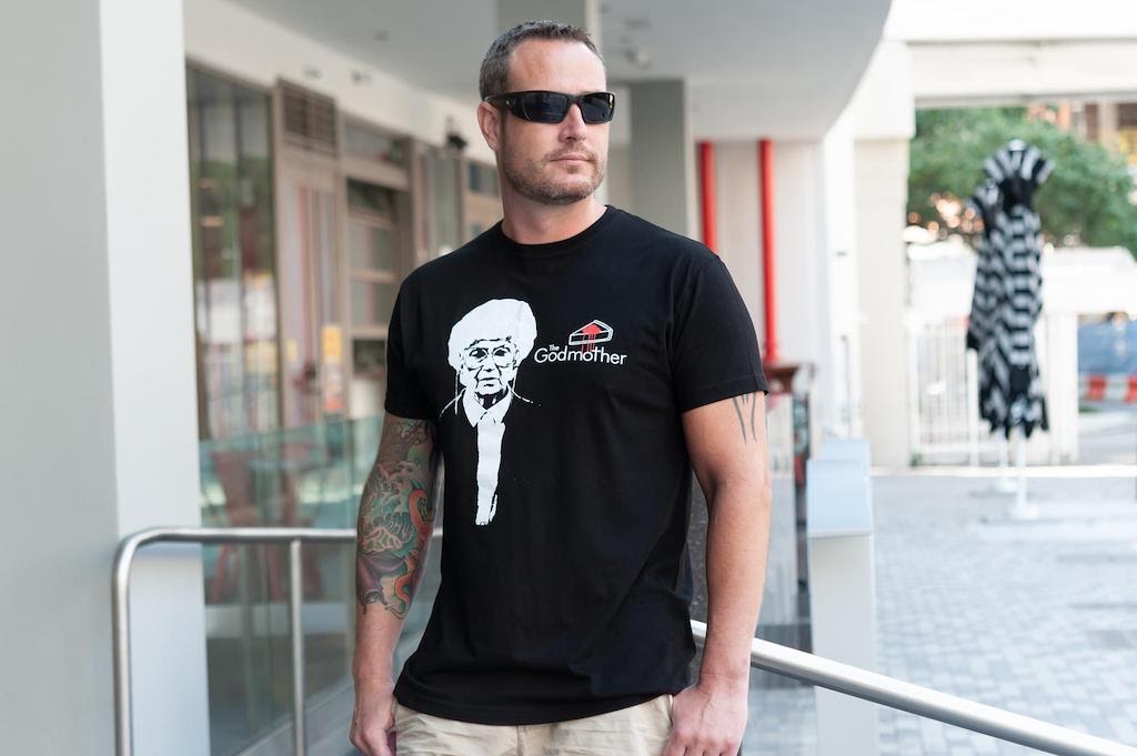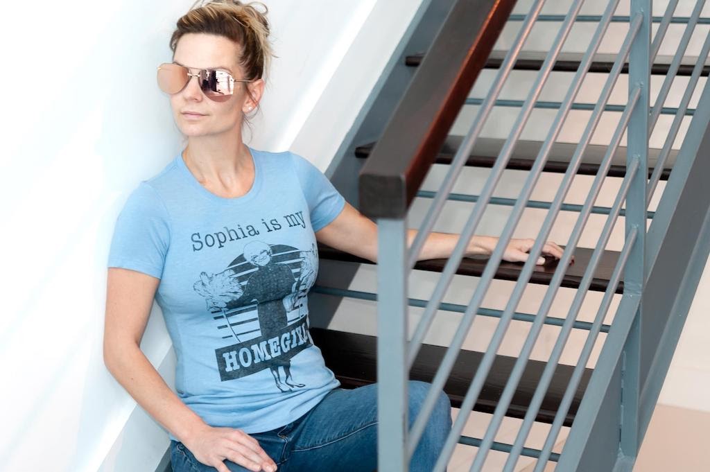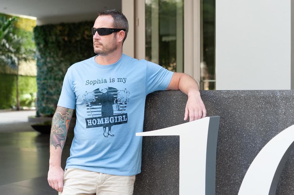 This shirt features a stoic picture of Sophia giving her best Marlin Brando Godfather impression. And instead of marionette strings, a good ol’ slice of cheesecake with cherry topping adds the finishing touch to this logo.